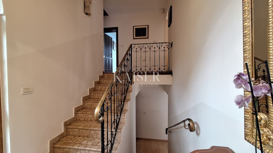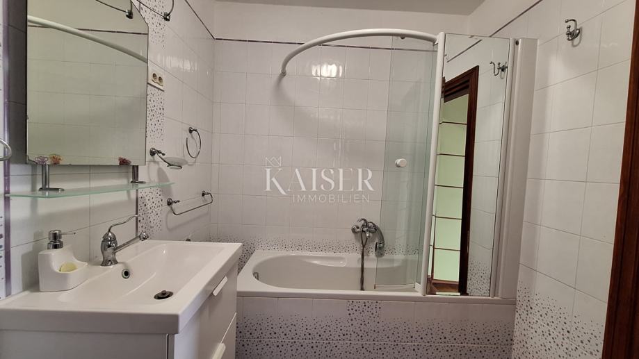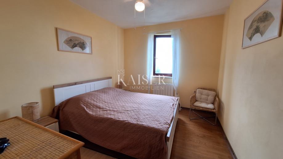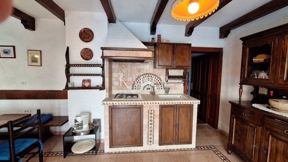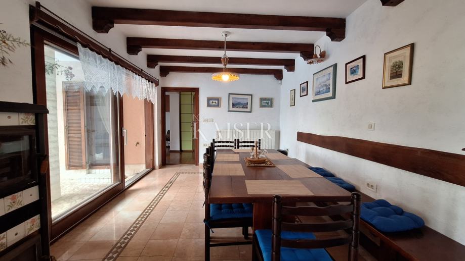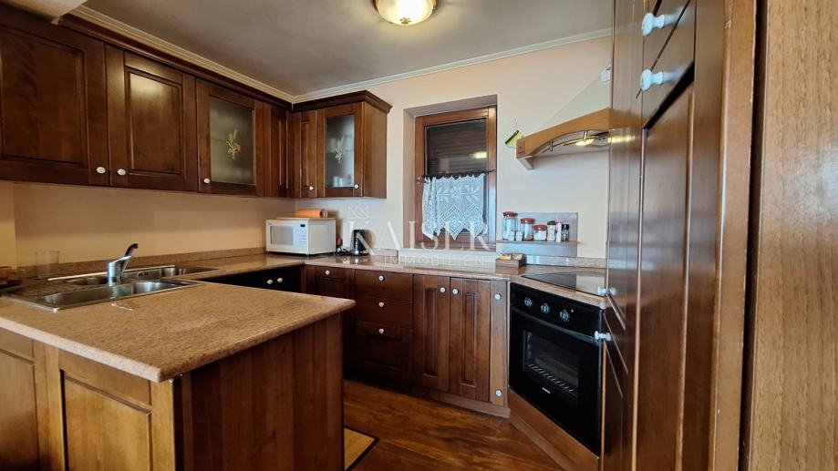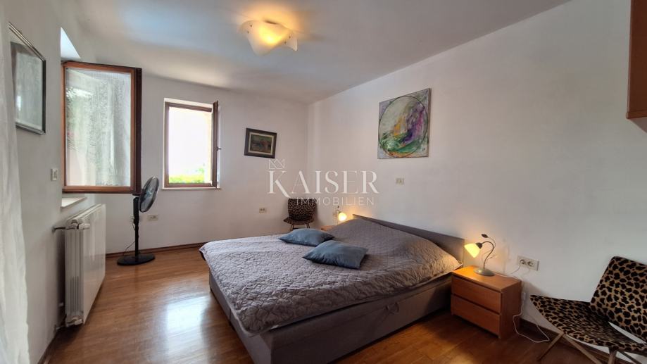 Na katu se nalaze 3 spavaće sobe, dvije kupaone, kuhinja, blagovaona s dnevnim boravkom i izlazom na terasu s koje se pruža prekrasan pogled na more i Rijeku s otocima. Grijanje objekta je centralno na naftu, u prizemlju je dobra i lijepa peć na drva, a u dnevnom boravku na katu je klima uređaj grijanje-hlađenje. Iz blagovaone u prizemlju izlazimo u vrt gdje se nalazi bazen s vanjskim tušem i sjenica s roštiljem, okružena zelenilom i lavandom, koju okružuju biljke mediteranskog podneblja. Kuća ima 2 parkirna mjesta. Nudi se potpuno namještena .