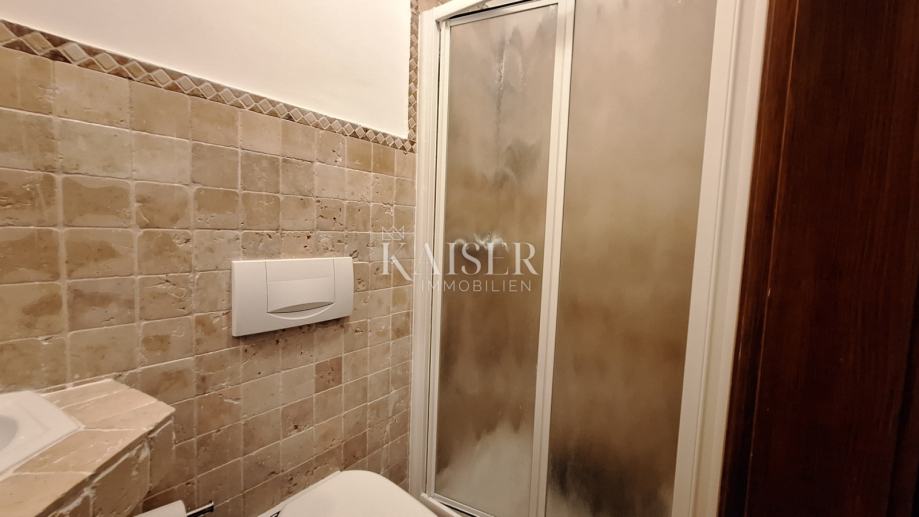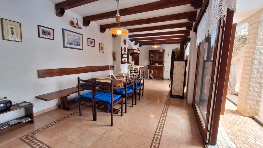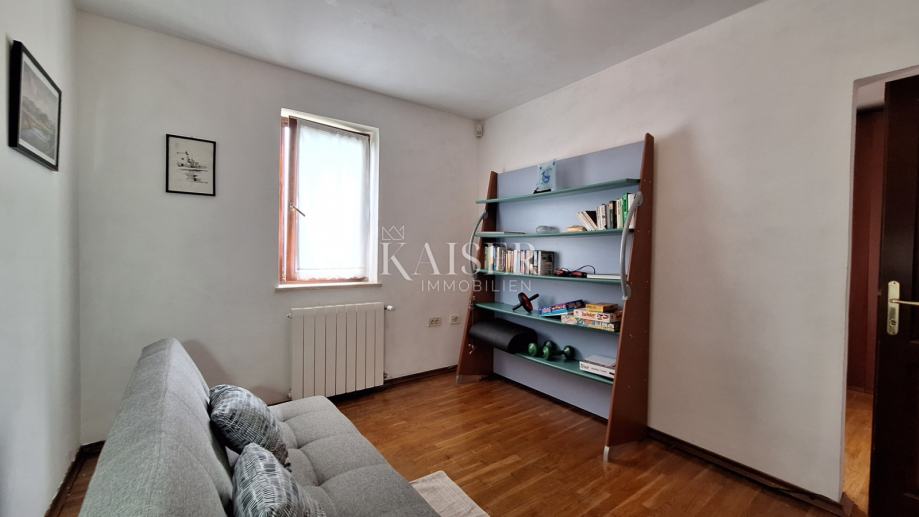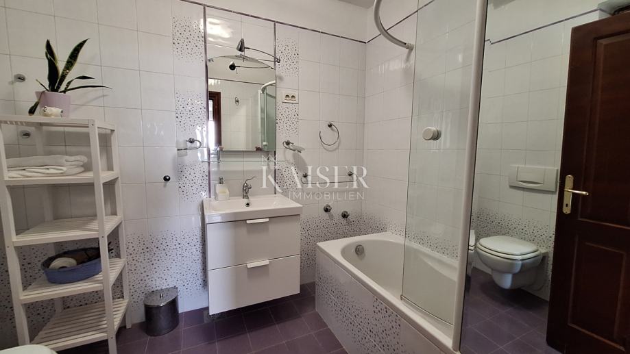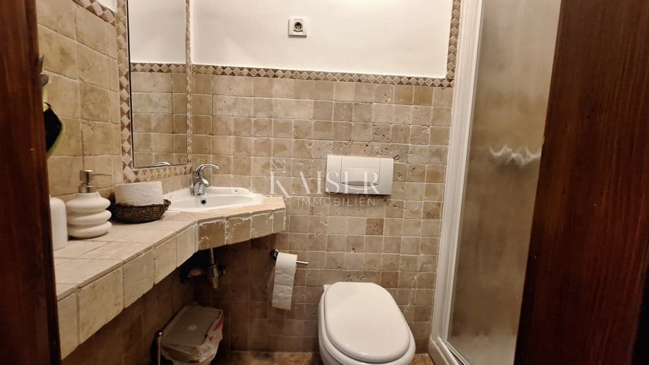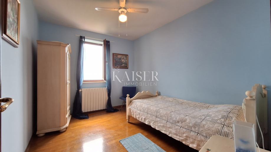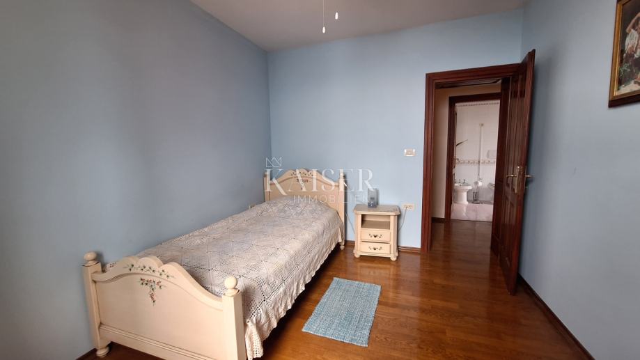 Na katu se nalaze 3 spavaće sobe, dvije kupaone, kuhinja, blagovaona s dnevnim boravkom i izlazom na terasu s koje se pruža prekrasan pogled na more i Rijeku s otocima. Grijanje objekta je centralno na naftu, u prizemlju je dobra i lijepa peć na drva, a u dnevnom boravku na katu je klima uređaj grijanje-hlađenje. Iz blagovaone u prizemlju izlazimo u vrt gdje se nalazi bazen s vanjskim tušem i sjenica s roštiljem, okružena zelenilom i lavandom, koju okružuju biljke mediteranskog podneblja. Kuća ima 2 parkirna mjesta. Nudi se potpuno namještena .