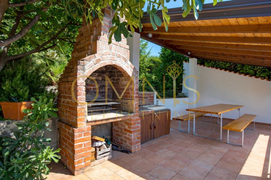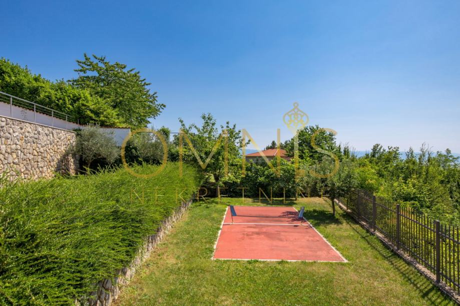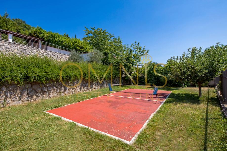 Prostrana okućnica je kultivirana te uređena raznovrsnim mediteranskim biljem. Tu se također nalazi grijani natkriveni bazen, teren za badminton, sunčalište, roštilj s sjenicom. Postavljen je i sustav automatskog navodnjavanja.