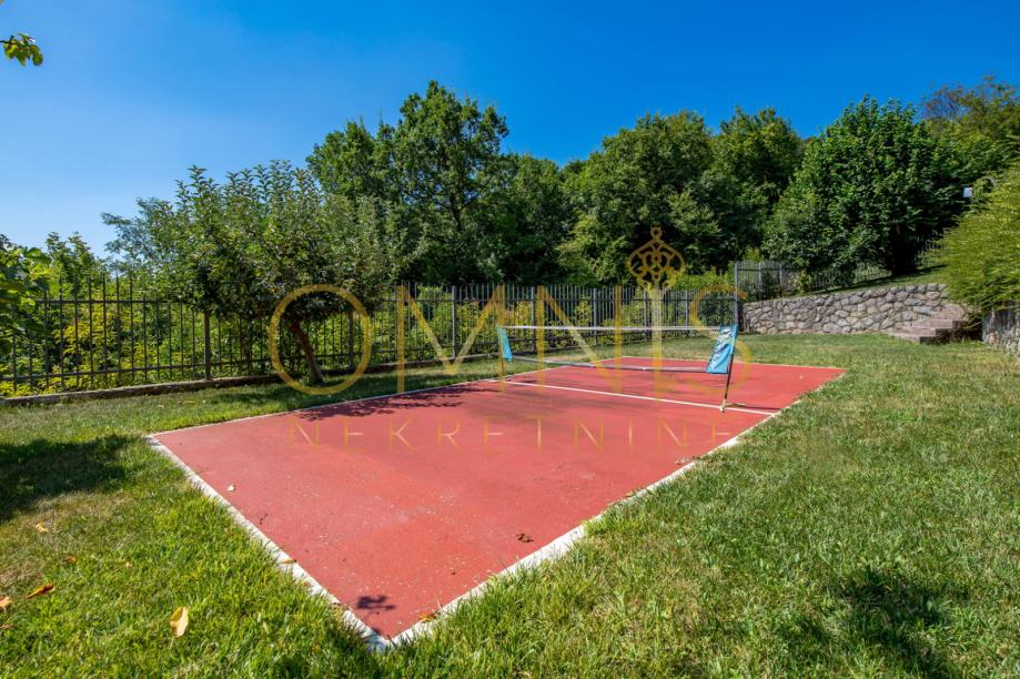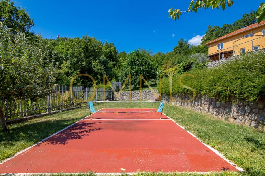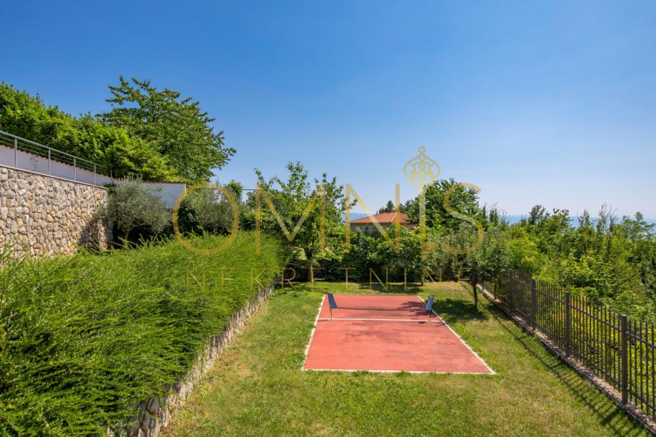 Prostrana okućnica je kultivirana te uređena raznovrsnim mediteranskim biljem. Tu se također nalazi grijani natkriveni bazen, teren za badminton, sunčalište, roštilj s sjenicom. Postavljen je i sustav automatskog navodnjavanja.