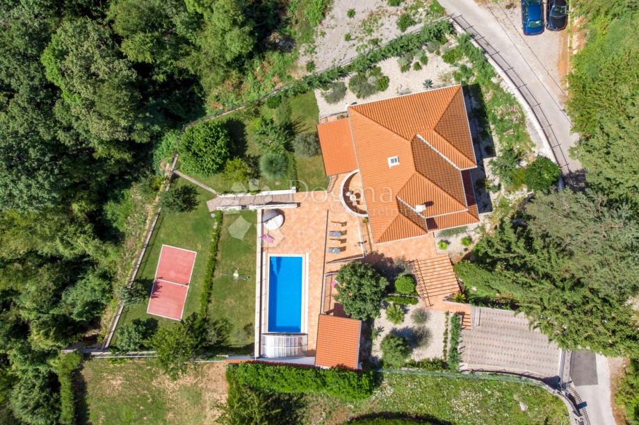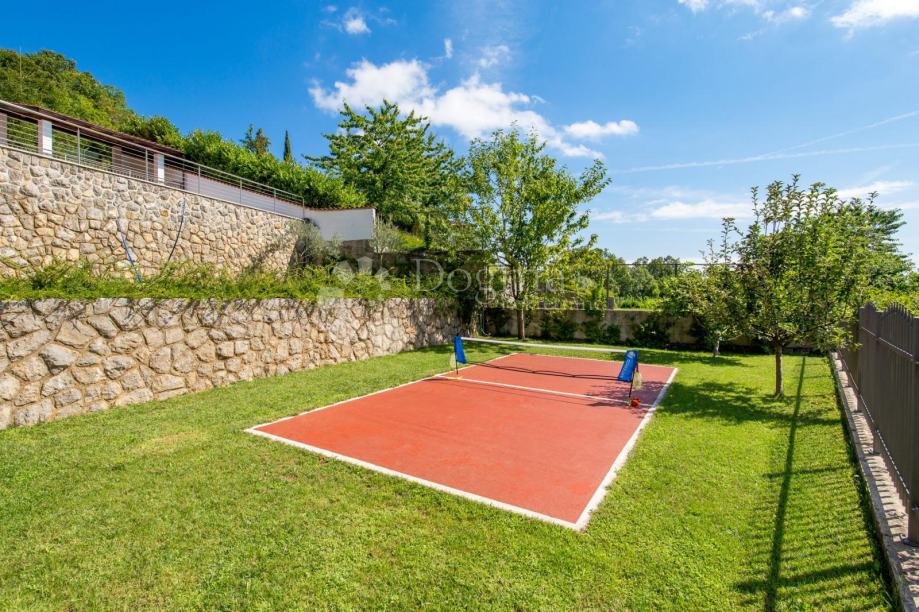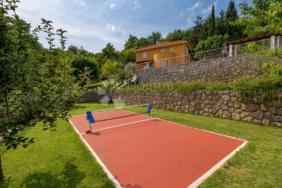 Velika okućnica sa puno mediteranskog i ostalog bilja upotpunjena je sadržajima kao što su natkriveni grijani bazen površine 32m2, sunčališta, roštilj sa sjenicom, teren za badminton i tenis.