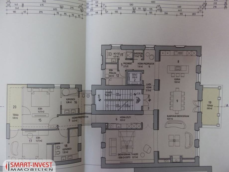 2. kat: 220,09 m2 (komforan trosoban stan s bibliotekom, predprostorom, garderobom, kuhinjom, blagovaonom, terasom i tri sanitarna čvora)