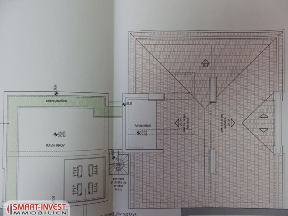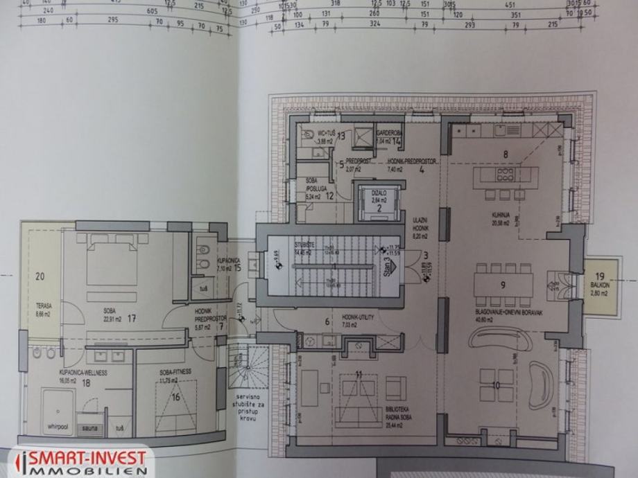Visoko potkrovlje: 213,71 m2 (komforan trosoban stan s bibliotekom, predprostorom, garderobom, kuhinjom, blagovaonom, wellnessom, tri sanitarna čvora, balkonom, terasom i pripadajućom krovnom terasom na ravnom krovu).