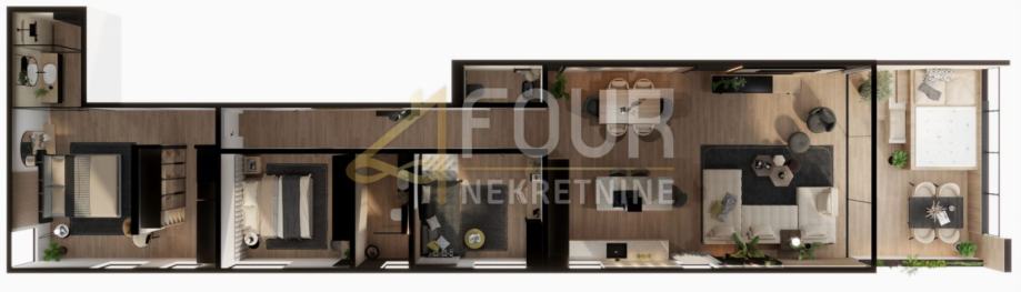 Stan se sastoji od tri spavaće sobe, prostranog dnevnog boravka s kuhinjom i blagovaonicom s izlazom na natkrivenu terasu, dvije kupaonice, odvojenog toaleta, garderobe i hodnika.