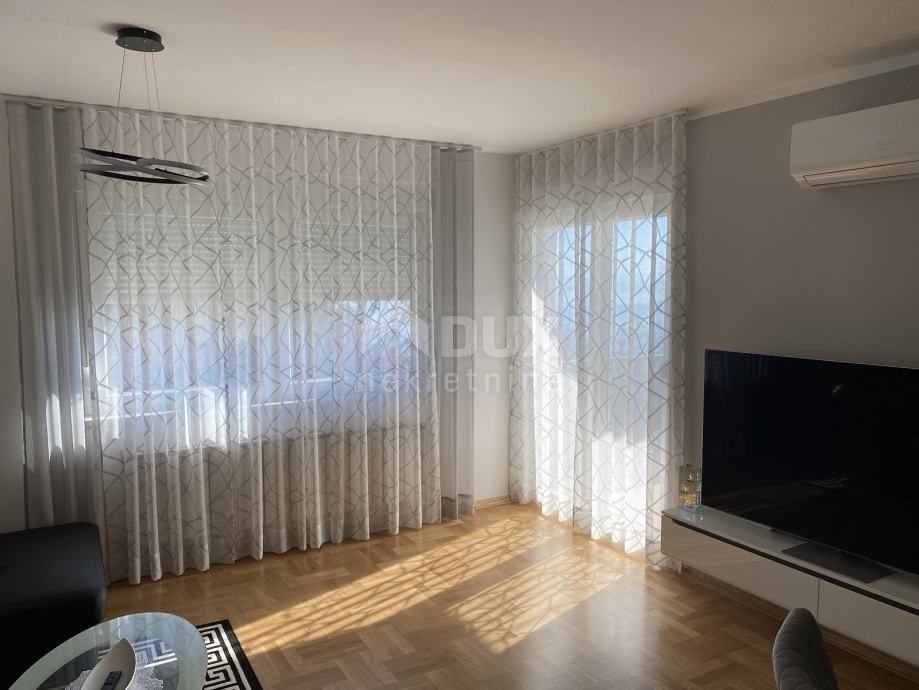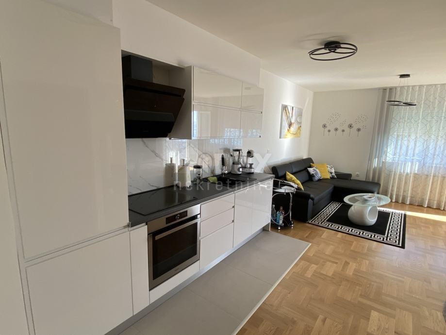 Stan je potpuno opremljen modernim i elegantnim namještajem koji pruža osjećaj udobnosti i svježine. Prostrana dnevna soba je središnji prostor stana, s velikim staklenim prozorima koji vam omogućuju prekrasan već spomenuti pogled. Iz dnevnog boravka izlazite na privatni balkon, savršeno mjesto za opuštanje i uživanje u svježem morskom zraku.