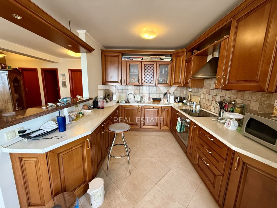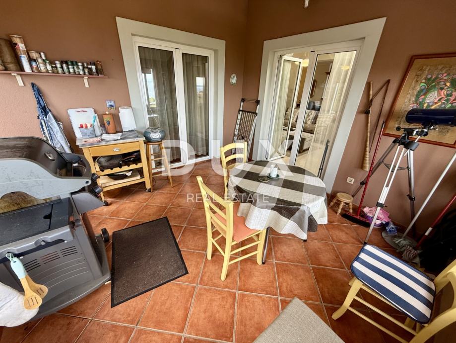 Sastoji se od dvije spavaće sobe, dva kupatila, hodnik, ostava, velike prostorije dnevnog boravka s kuhinjom i blagovaonicom, te predivne natkrivene terase. Raspored stana je odličan. Stan je uređen i useljiv. Grijanje na drva i klima uređajem. Terasa prostrana s pogledom na more. Pripada mu ostava!