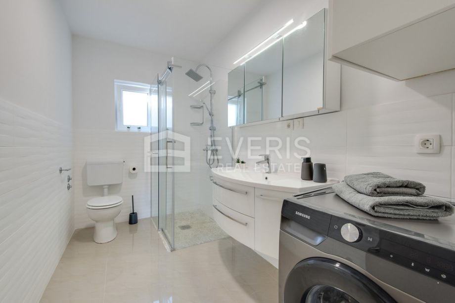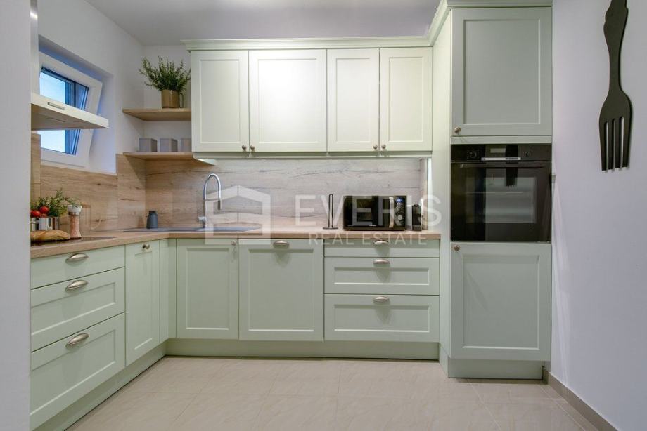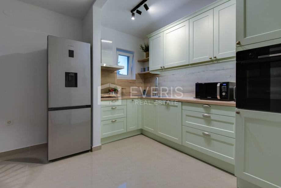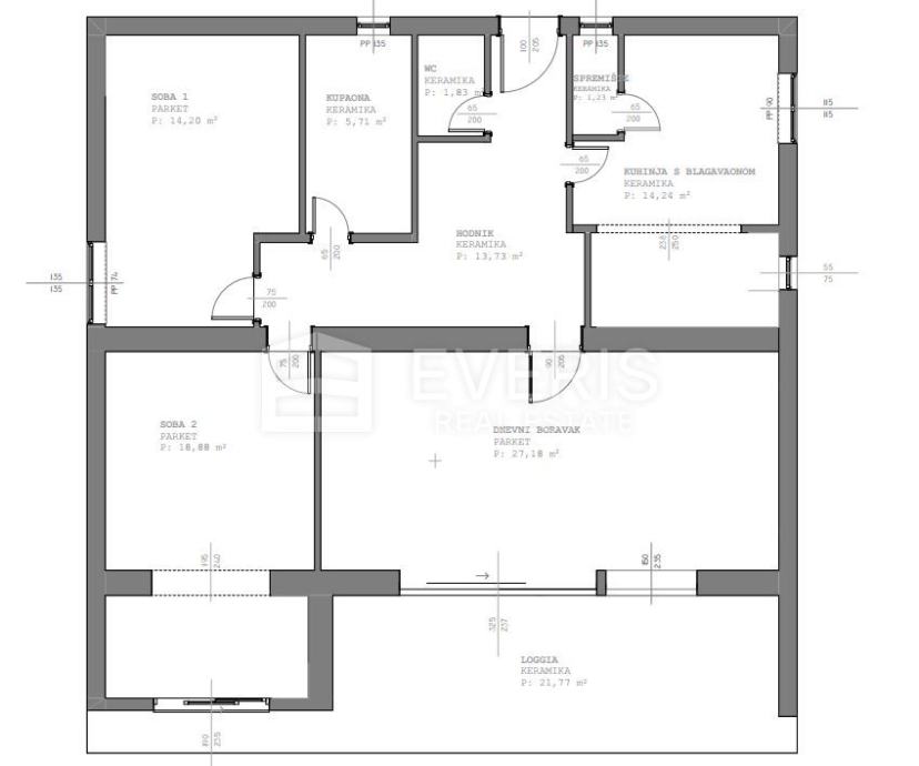 ▪ dnevnog boravka (27,18 m2), dvije spavaće sobe (33,08 m2), kupaonice (5,71 m2), toalet (1,83 m2), kuhinje s blagovanicom (14,24 m2), spremišta (1,23 m2), hodnika (13,73 m2) te loggie (21,77 m2) ukupne površine stana 118,77 m2.