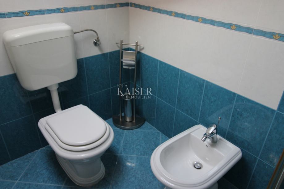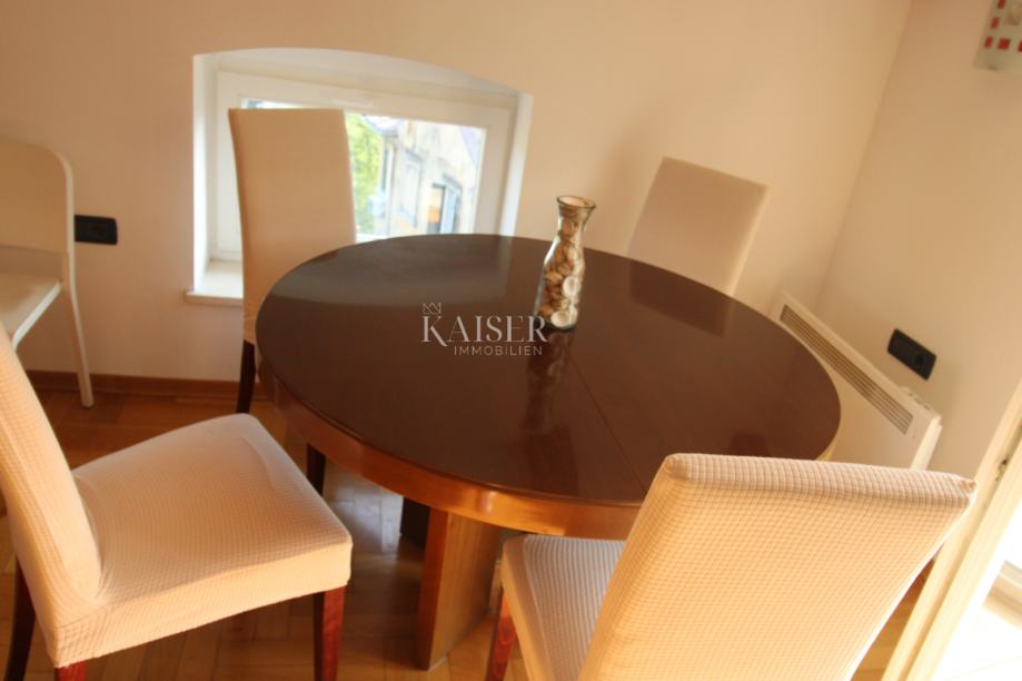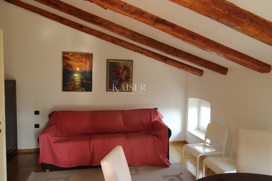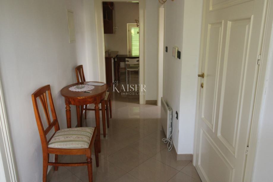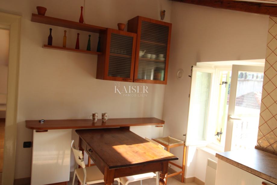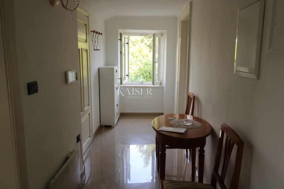 U malom ribarskom mjestu Volosko kraj Opatije smjestila se ova nekretnina svega cca 100 metara udaljena od mora i prekrasnih plaža kao što su Črnikovica,"Puntica" i ostale na tom potezu ,okružena većom okućnicom u zelenilu i vrtovima na korištenje s svega tri vlasnika u kući. Sam prilaz objektu je onemogućen vrtnim željeznim vratima, tako da sam objekt i njegov okoliš imaju punu privatnost. Zgrada tj. stanovnici Opatije a tako i Voloskog imaju pravo na povlašteni parking koji se plaća .a u neposrednoj blizini je parking zona. Stan se sastoji od hodnika, kuhinje s blagovaonom, dnevnog boravka s izlazom na terasu s koje gledamo u zelenilo i more i kupaone s toaletom sve na površini od 59 m2.Na međukatu nalazi se vanjska manja kupaona s toaletom koja se koristi zajedno s manjom vrtnom kućicom i vrtom površine cca 100 m2.Svakom stanu u okućnici pripada dio vrta zajedničke okućnice na korištenje. Do samog mora i prvih plaža treba nam par minuta hoda. Ova izuzetna lokacija nudi nam potpuni mir i relax, a tako blizu svih sadržaja potrebnih za život i prekrasne Opatijske šetnice Lungo mare i samih plaža.