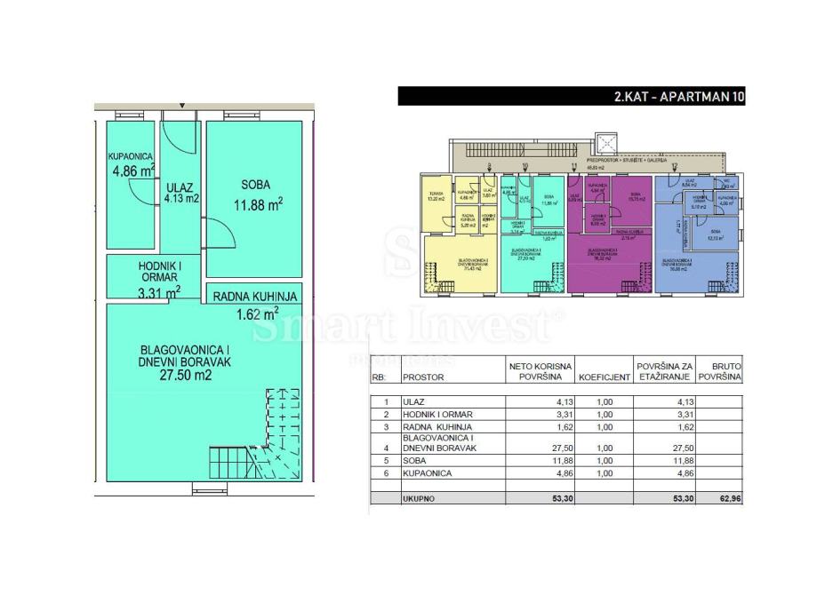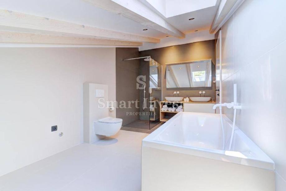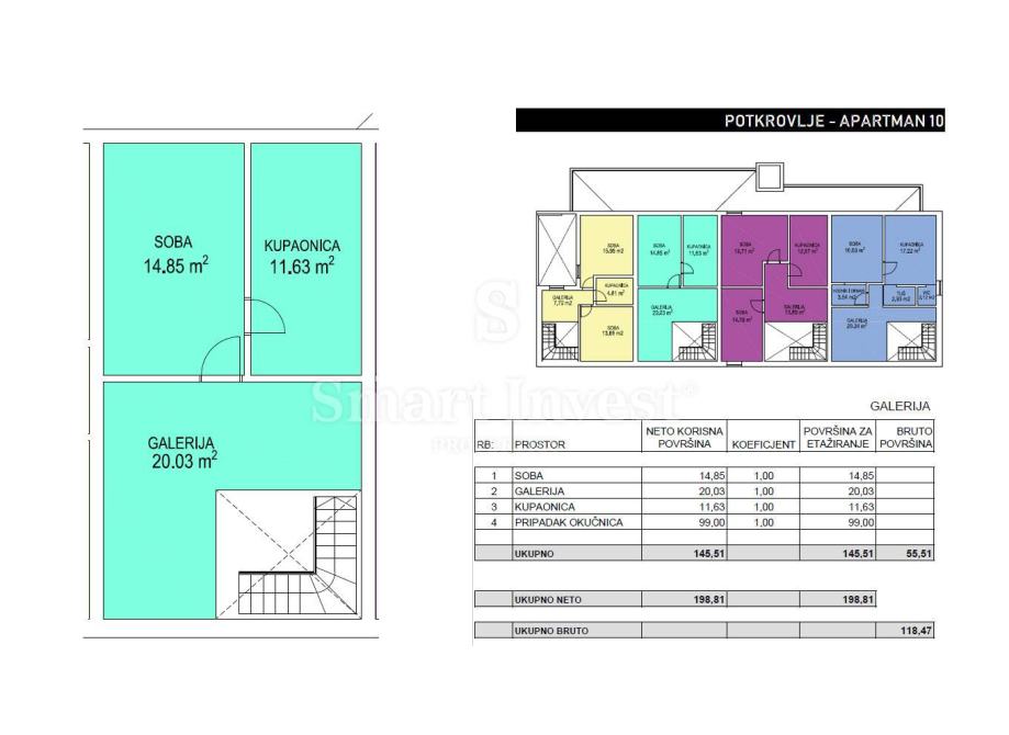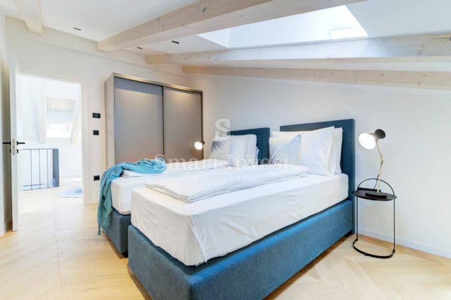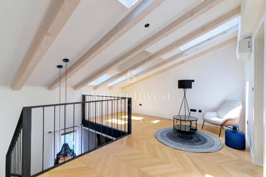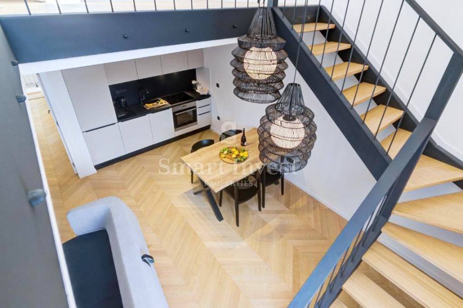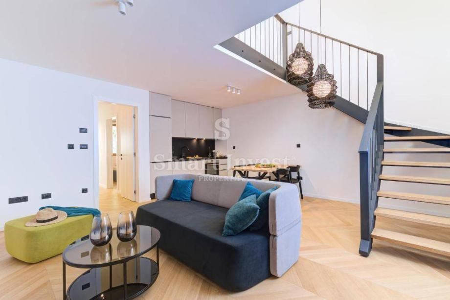 Dvoetažni apartman površine 99.81 m2 nalazi se na 2. katu i u visokom potkrovlju. Na donjoj etaži se nalazi ulazni hodnik, prostrani dnevni boravak s kuhinjom i blagovaonicom, spavaća soba, kupaonica. Na gornjoj etaži smještena je galerija, spavaća soba i velika kupaonica.