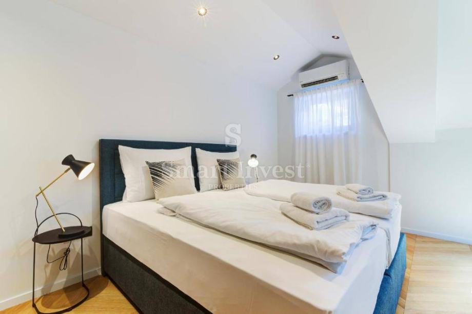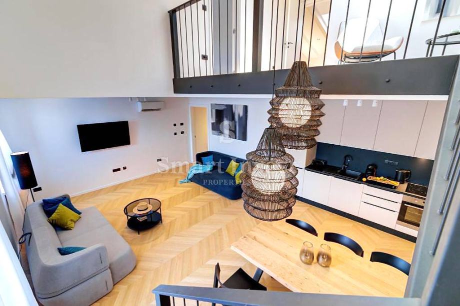 Dvoetažni apartman površine 132.51 m2 nalazi se na 2. katu i u visokom potkrovlju. Na donjoj etaži se nalazi ulazni hodnik, prostrani dnevni boravak s kuhinjom i blagovaonicom, predprostor, spavaća soba s vlastitom kupaonicom. Na gornjoj etaži smještena je galerija, još dvije spavaće sobe i velika kupaonica.