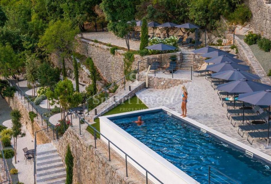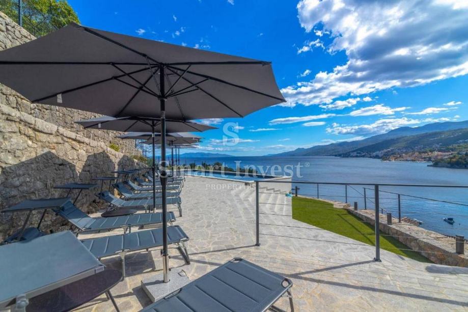 Luksuzni resort sa ukupno 15 vrhunski opremljenih stanova/apartmana smješten je na iznimnoj lokaciji 1. red do mora, s direktnim izlazom na plažu. Teritorij resorta koji se prostire na 3.149 m2 prekrasno je uređen s terasastim vrtovima, zajedničkim bazenom od 60 m2 i sunčalištem s predivnim panoramskim pogledom na cijeli Kvarnerski zaljev. Svakom apartmanu pripada privatni hortikulturno uređeni vrt.