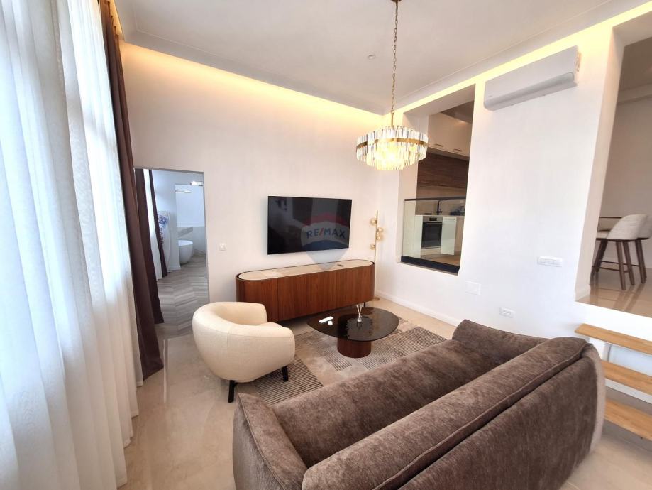 Stan ima dva nivoa, a sastoji se od kuhinje s blagovaonicom i toaleta na povišenom dijelu te dnevnog boravka i spavaće sobe s kupaonicom na donjem dijelu. Površina stana iznosi 50 m2.