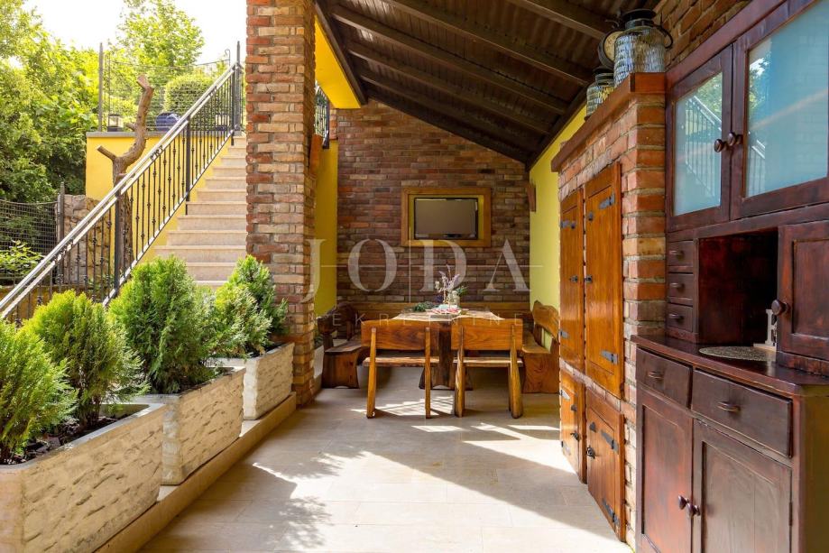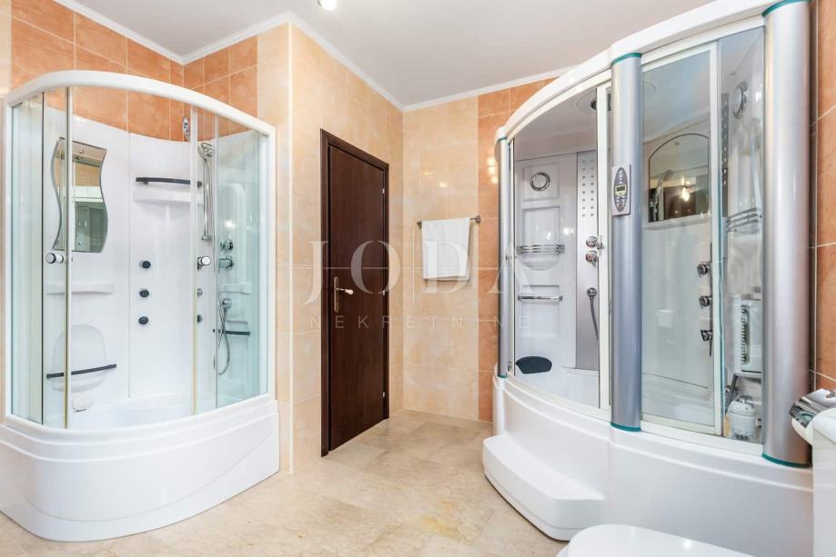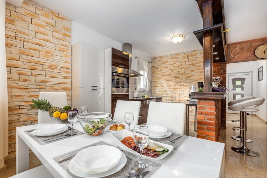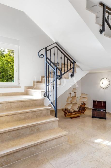 U suterenu je velika konoba te vanjski i unutarnji prostor za druženje potpuno uređeni i opremljeni. Uz najdonji dio smješteno je dječje igralište. Na gornjoj etaži (u naravi prizemlje) je sa stražnje strane zasebni trosobni stan sa izlazom na okućnicu te dvosobni stan sa velikim terasama i ukusno uređenim dnevnim dijelom.