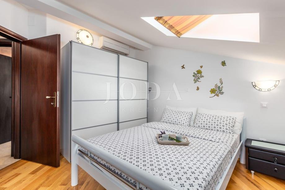 Vanjske stepenice vode na kat gdje se ulazi u veliki dvoetažni peterosobni stan sa terasama sa kojih je pogled na more.