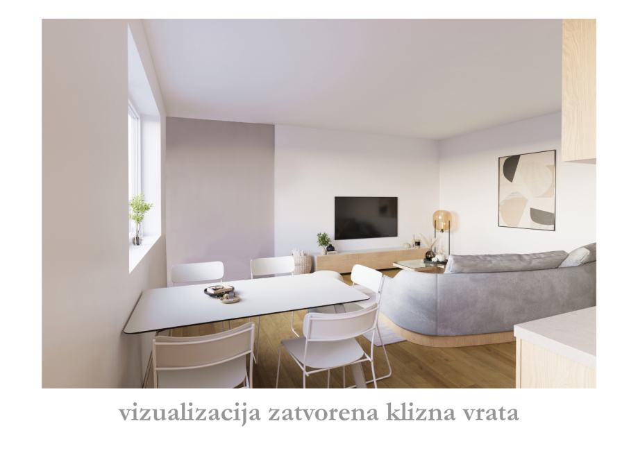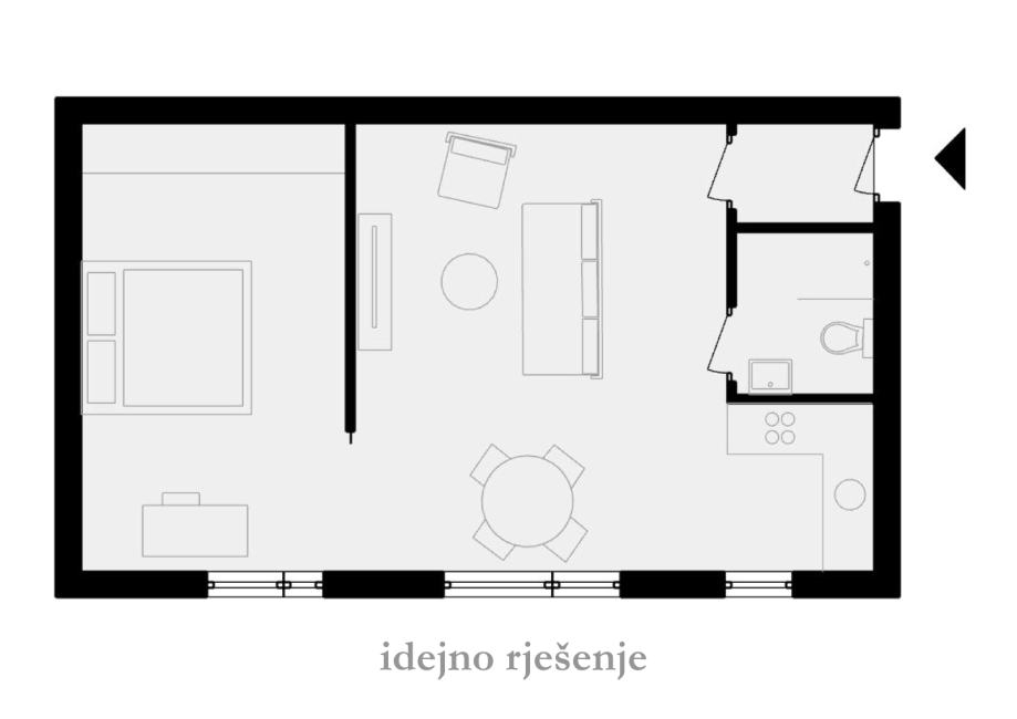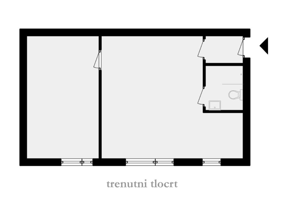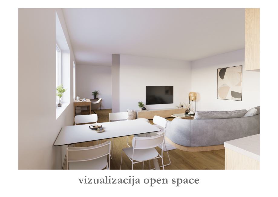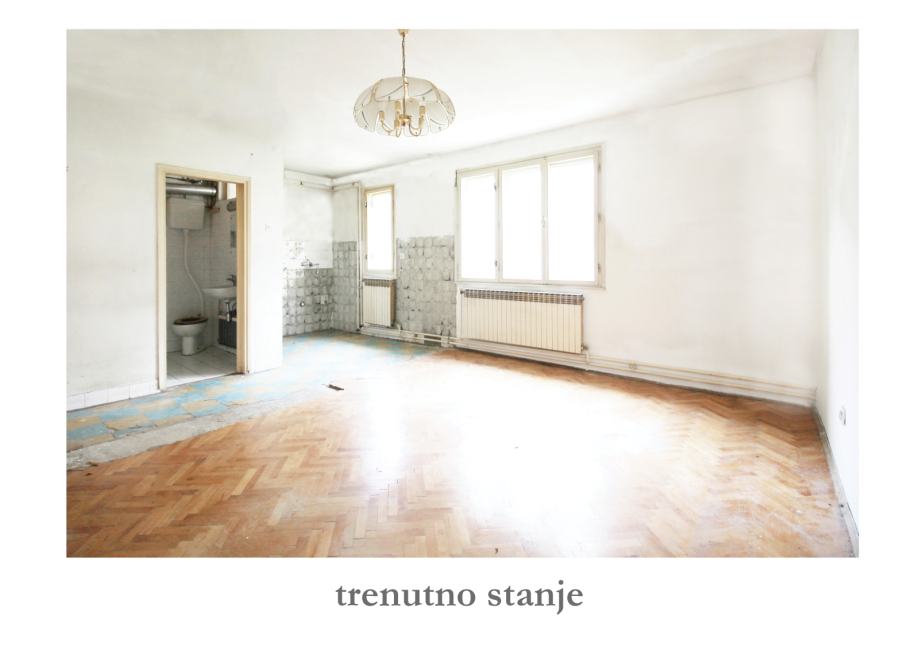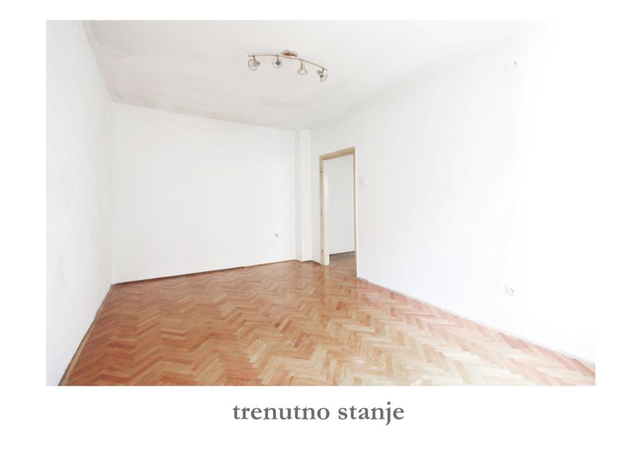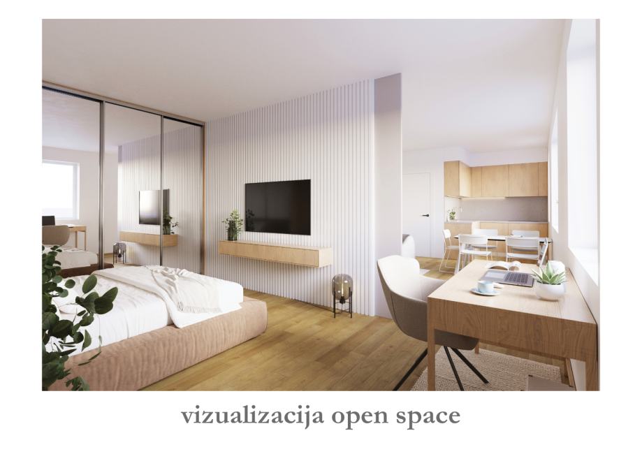 Stan se sastoji od ulaznog hodnika, open space dnevnog boravka s blagavaonicom i kuhinjom, te spavaće sobe i kupaonice. Spavaća soba je trenutno odvojena od dnevnog boravka nenosivim zidom, a adpatacijom se može manji dio tog zida zamjeniti kliznom stijenom s ciljem dobivanja velikog open space prostora kao na slikama. Slike s namještajem su digitalne vizualizacije idejnog rješenja. Stan se za izraženu cijenu prodaje u trenutnom stanju.