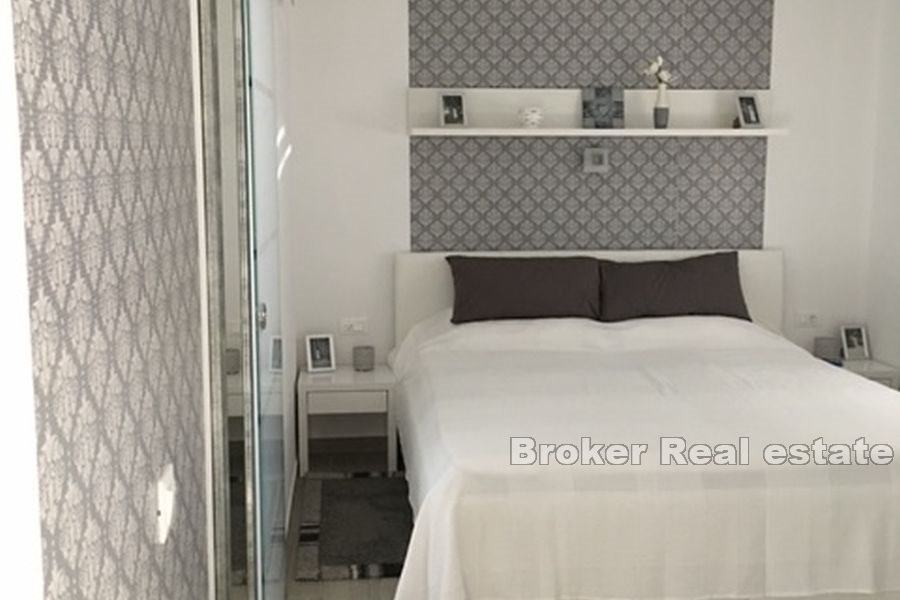 Kuća površine 236 m2 ima: 2 spavaće sobe, 3 kupatila, 2 garderobe, hodnik, prostrani dnevni boravak od 60 m2 sa trpezarijom, potpuno uređenom i opremljenom kuhinjom (uvoz iz Njemačke, visoko kvalitetna sa svim aparatima), loggia, ukupno 5 terasa (prednja terasa 52 m2). U suterenu se nalaze 2 potpuno uređena apartmana od 46 m2 i 38m2 .