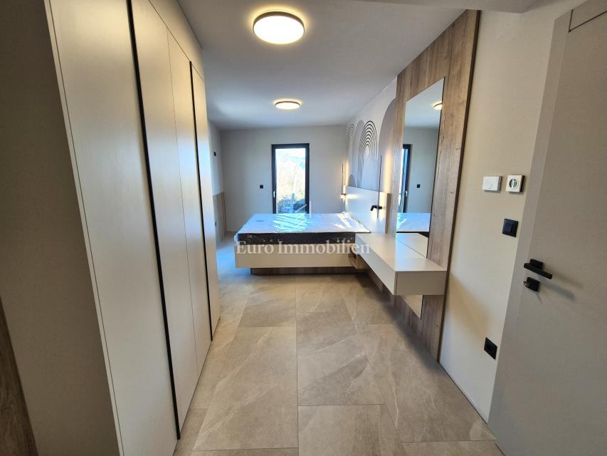 Prodaje se novogradnja u Omišlju tlocrtno korisne stambene površine 81.54 m2 s natkrivenim balkonom površine 5,12 m2, natkrivene terase površine 18,97 m2 i nenatkrivene terase površine 12,07 m2. Apartman se nalazi na drugom katu i sastoji se od otvorenog koncepta kuhinje s blagovaonom i dnevnim boravkom, dvije spavaće sobe i dvije kupaonice. Na natkrivenom dijelu terase se nalazi funkcionalna ljetna kuhinja, a s terase se pruža otvoren pogled na more. Apartman ima dva parkirna mjesta površine 25 m2 i okućnicu površine 26 m2 koja se nalazi pokraj parkinga. Uz parkirna mjesta se nalazi priprema za punjač električnog vozila i izvod vode. Apartman je opremljen protuprovalnim vratima, kvalitetnom keramikom i sanitarijama, PVC stolarijom s ALU roletama, provedeno je podno grijanje u svim prostorijama i klimatizacija preko dizalice topline Viessmann. Apartman se prodaje potpuno namješten namještajem po mjeri.