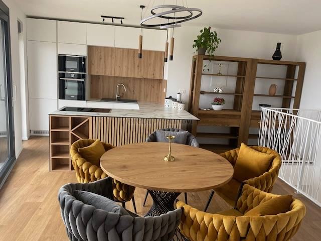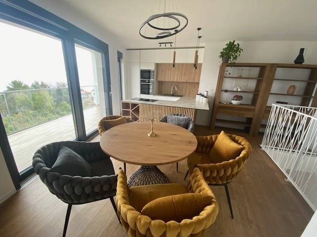 Moderan i lijepo i kvalitetno namješteni i opremljeni stan u Iki, u novogradnji okruženoj zelenilom s otvorenim pogledom na more. Stan je dvoetažni na prvom i drugom katu, a sastoji se od dvije spavaće sobe, dvije kupaone, hodnika na prvoj etaži i dnevnog boravka, dviju terasa i wc-a na drugoj etaži. Grijanje je podno i klima uređaji Panasonic/dizalica topline. Stan je južne orijentacije. Sve je potpuno novo. namještaj i sve perilice rublja i suđa kao i aparati. Internet/optika je aktivan. Dva parkirna mjesta su u okućnici, koje ima priključak/punjenje za električna vozila. Režije se plaćaju posebno. Dva garantna pologa su obavezna.