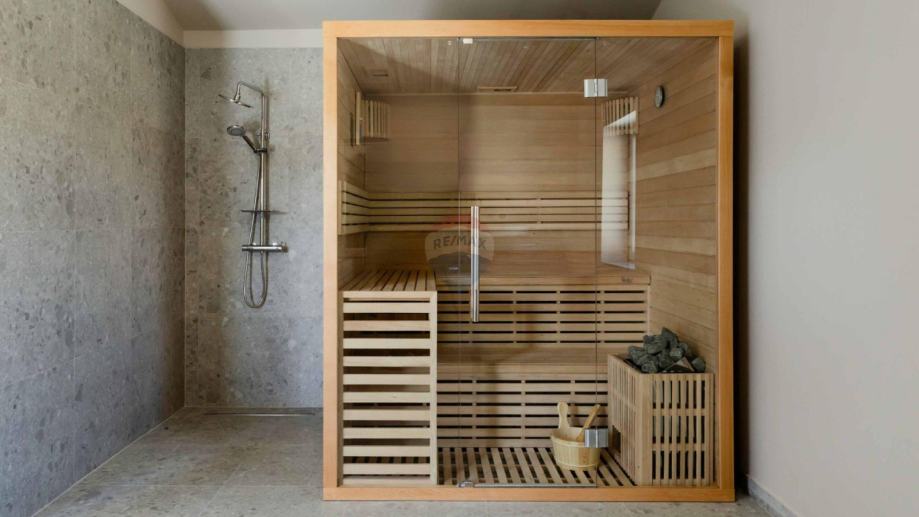 Kuća je površine 150 m2, do nalazi se poseban objekt koji služi kao zona za odmor sa saunom, priručnom kuhinjom, mini teretanom, tušom i toaletom.