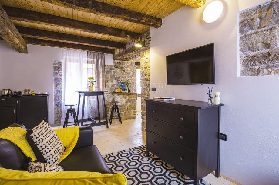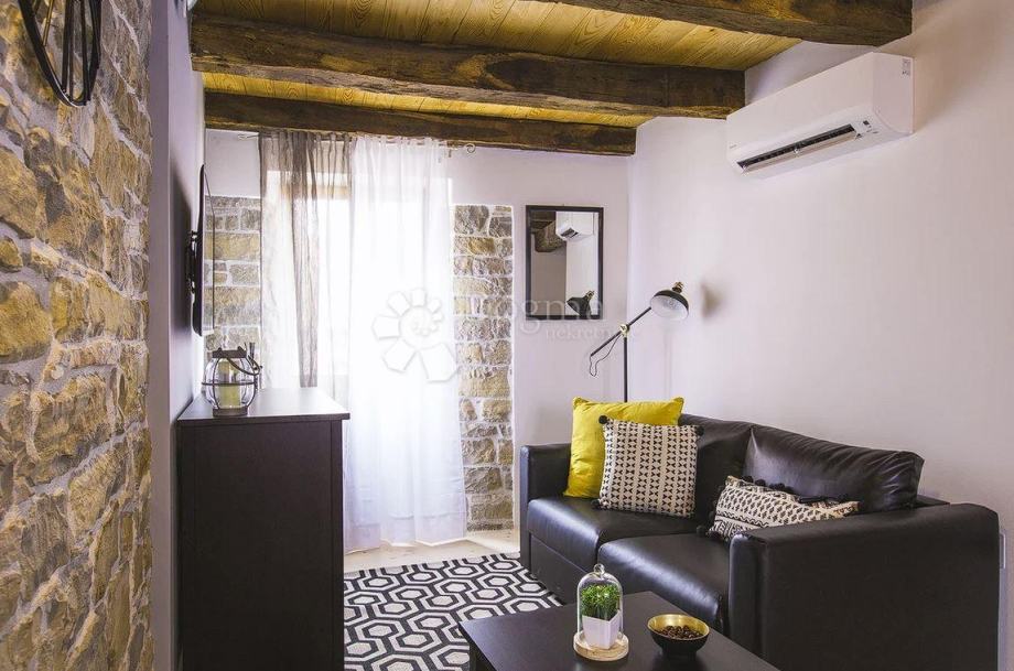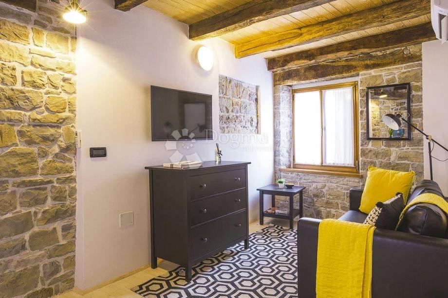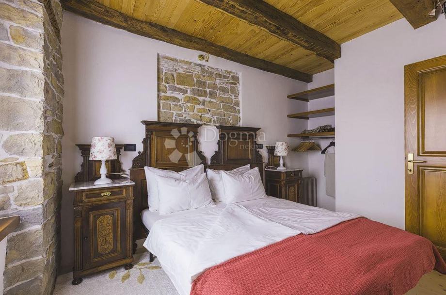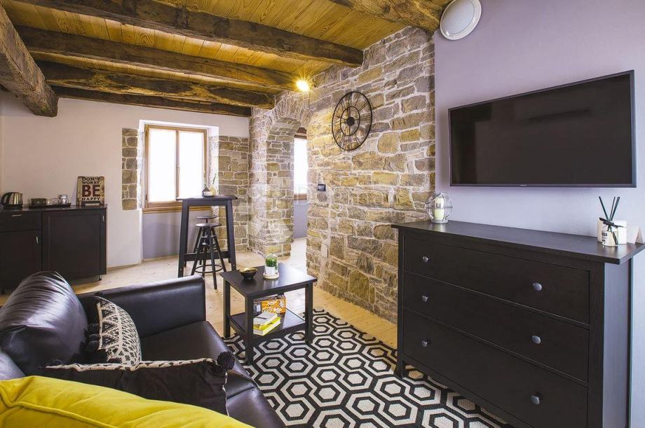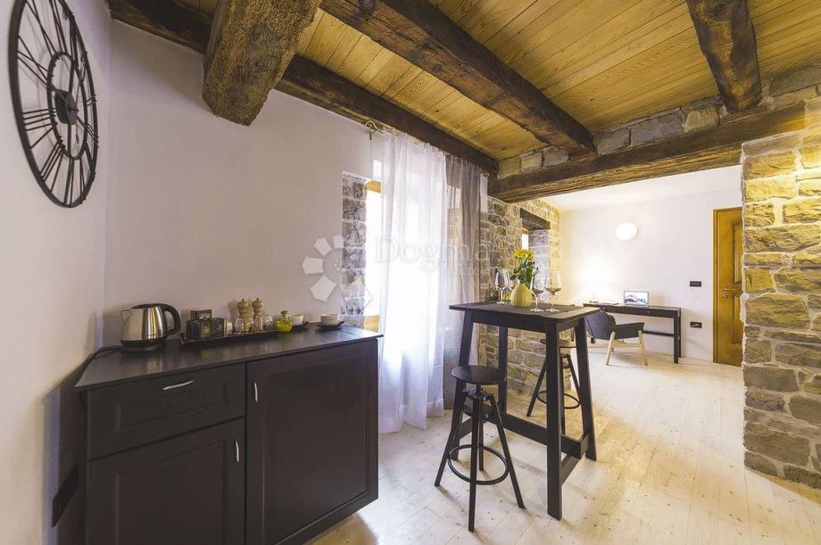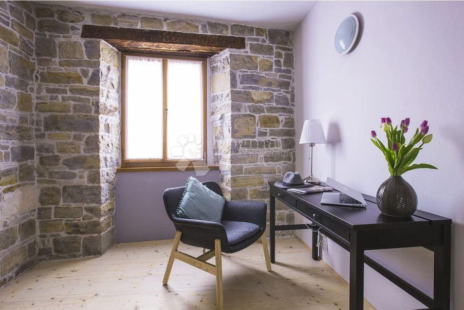 Na gornjim katovima nalaze se ukusno dizajnirani apartmani, svaki s prostranim dnevnim boravkom, udobnom spavaćom sobom i dobro opremljenom kupaonicom. Ovi apartmani su potpuno klimatizirani i namješteni, nudeći sve moderne udobnosti dok istovremeno čuvaju bogatu povijesnu arhitekturu zgrade. Svaki kat pruža jedinstven pogled na šarmantne ulice Oprtlja, stvarajući savršen ambijent za udoban život ili iznajmljivanje.