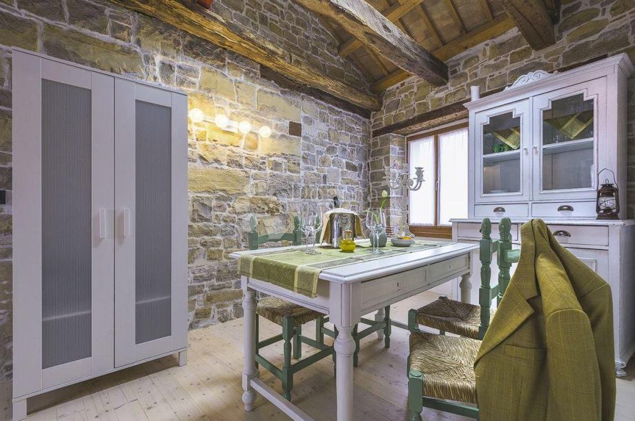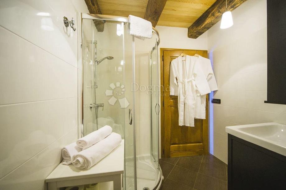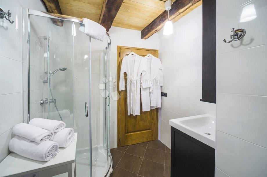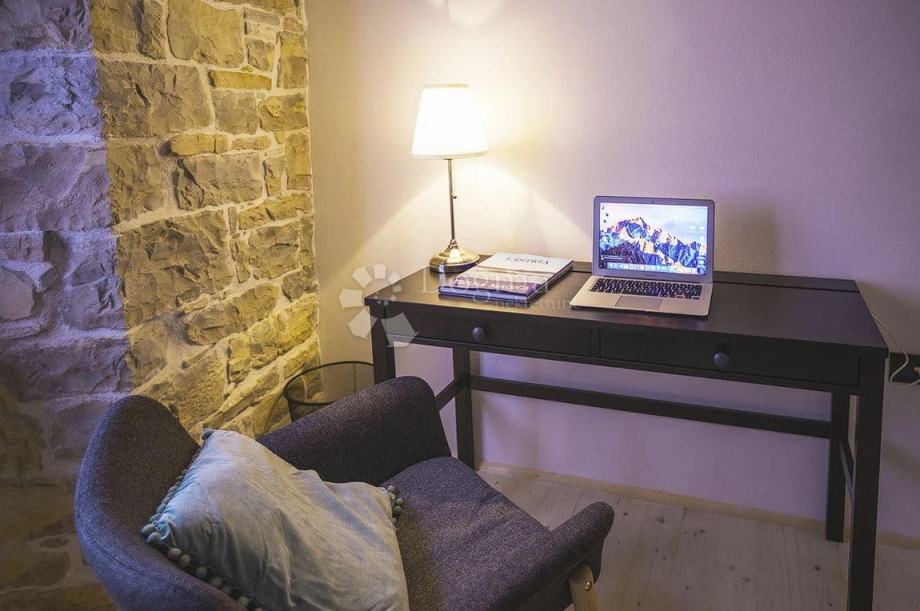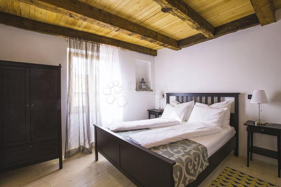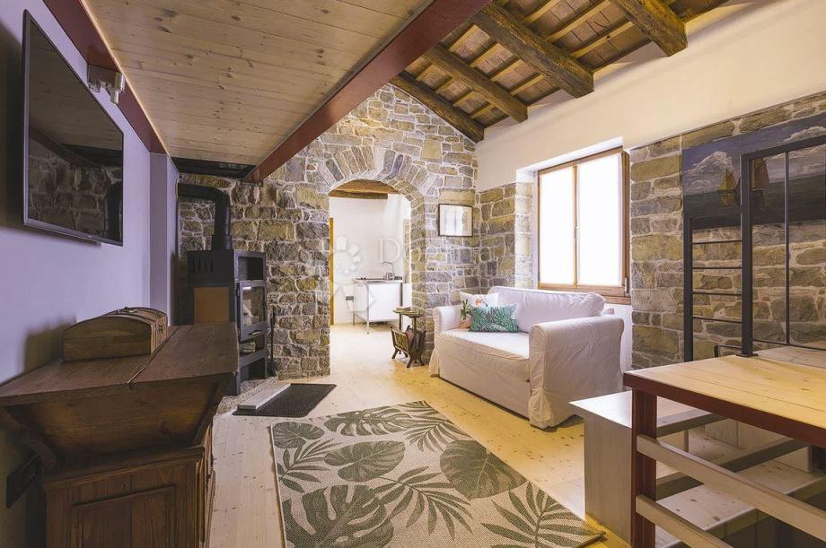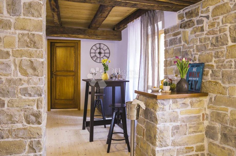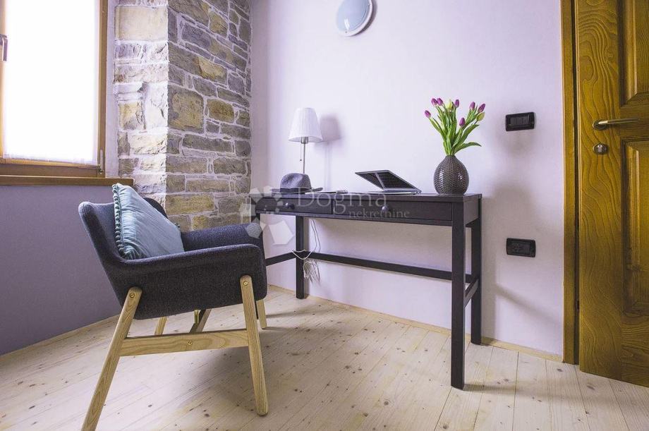 Na gornjim katovima nalaze se ukusno dizajnirani apartmani, svaki s prostranim dnevnim boravkom, udobnom spavaćom sobom i dobro opremljenom kupaonicom. Ovi apartmani su potpuno klimatizirani i namješteni, nudeći sve moderne udobnosti dok istovremeno čuvaju bogatu povijesnu arhitekturu zgrade. Svaki kat pruža jedinstven pogled na šarmantne ulice Oprtlja, stvarajući savršen ambijent za udoban život ili iznajmljivanje.