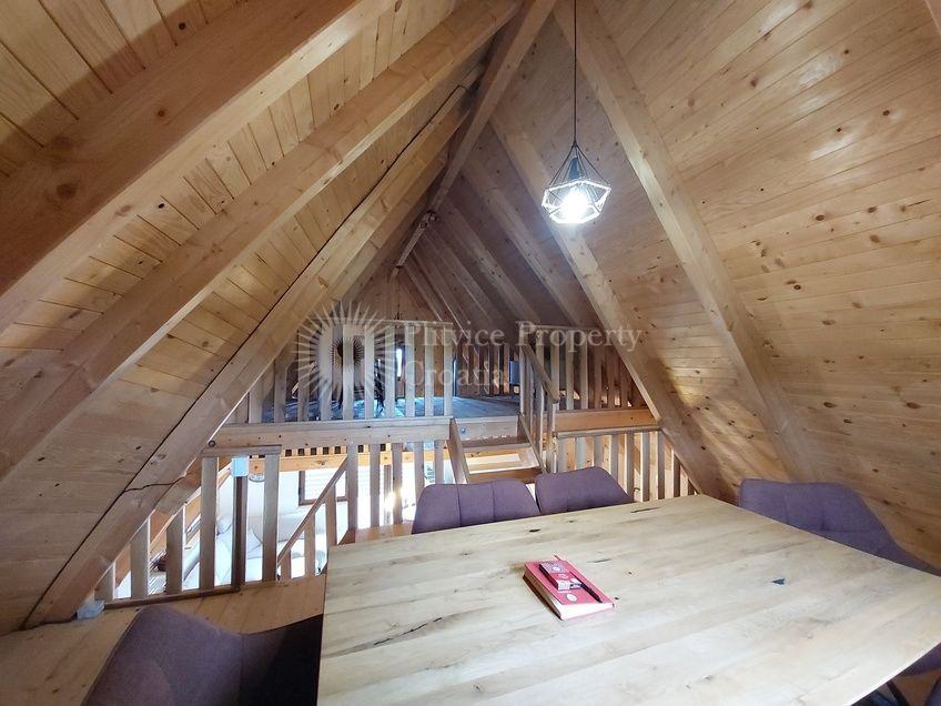 Gornja etaža uključuje dva galerijska prostora povezana povišenom platformom. Jedna galerija nudi prostor za sjedenje sa stolom, dok je druga opremljena krevetom, nudeći jedinstveni povišeni prostor za spavanje s panoramskim pogledom na rijeku.