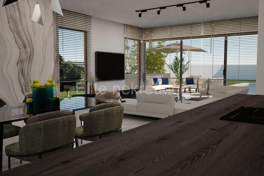 U prizemlju vile nalazi se open space prostor s kuhinjom, blagovaonom i dnevnim boravkom s izlazom na terasu i bazen, jedna spavaća soba s kupaonom, i gostinski wc i kupaona