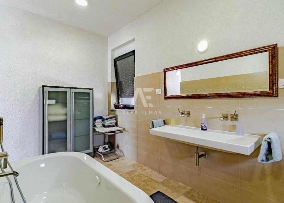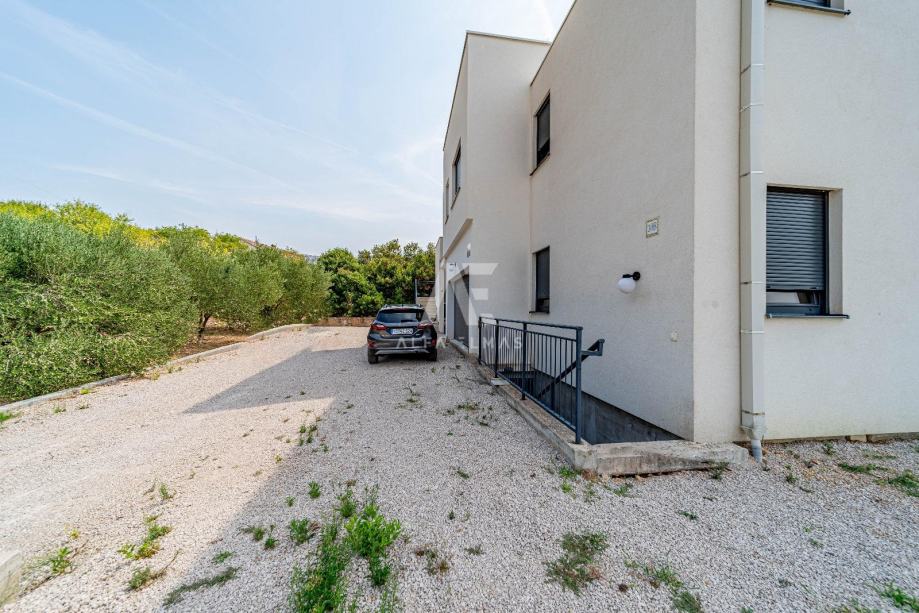 Okućnica je uređena i prilagođena boravku na otvorenom, s bazenom, roštiljem i vanjskim tušem. Na raspolaganju je dvostruka garaža u podrumu površine oko 20 m² te dodatna parkirna mjesta, ukupno dovoljno za četiri do pet automobila. Objekt posjeduje uporabnu dozvolu, a vlasništvo i dokumentacija su uredni.