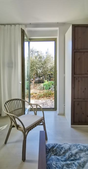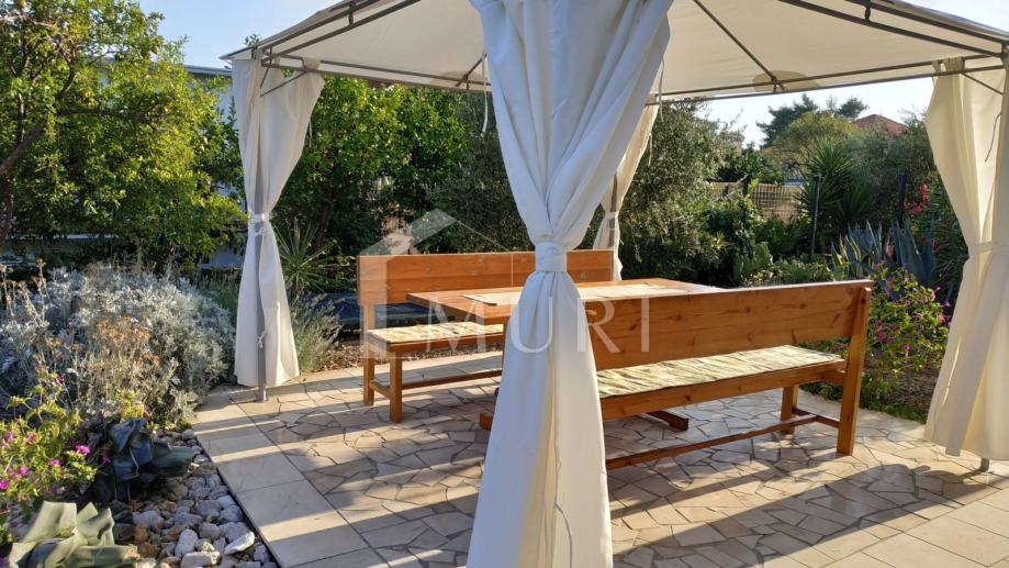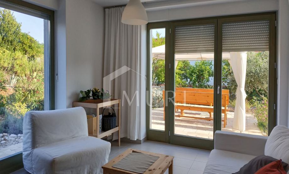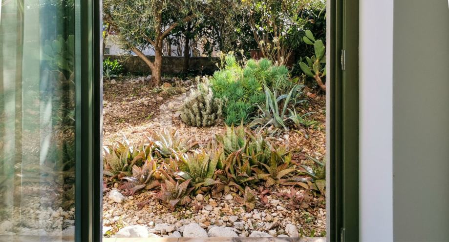 Posebna prednost ove nekretnine je vrt površine oko 174 m² – iznimno velika površina za ovu udaljenost od mora. Vrt je ograđen i lijepo uređen, s kamenim popločenjem i zasađen mediteranskim voćkama poput limuna, naranče, mandarina i maslina. Idealno je mjesto za odmor, obiteljska druženja, opuštanje, vrtlarenje ili postavljanje vanjskog sadržaja poput roštilja, pergole ili ležaljki.