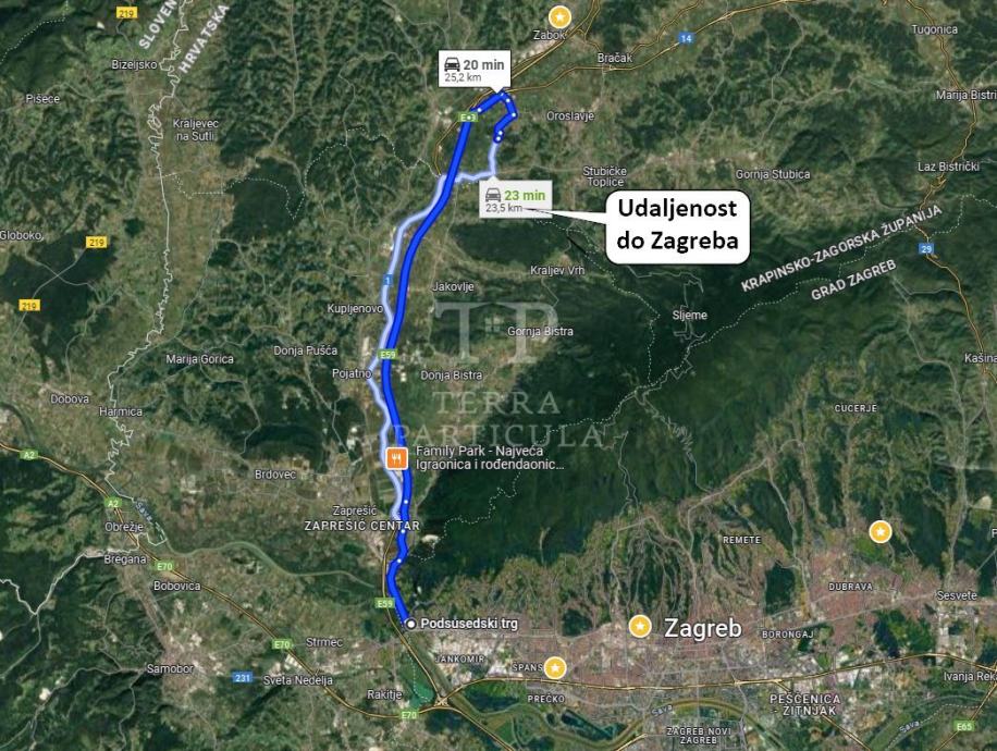 Na prodaju nudimo zemljište površine 10.500 m² od čega je u građevinskoj zoni 1.439 m² dok je ucrtano jezero površine 5.337 m² i oko njega čestica naziva perivoj površine cca 3.700 m². Plin, struja i voda su u neposrednog blizini ponuđenog zemljišta. Adresa građevine (Kurija Kaniža) u čijoj se blizini ponuđeno zemljište nalazi je Krušljevo Selo 234, Oroslavje. Udaljenost do naplatnih kućica Zabok/Oroslavje je 2 km.