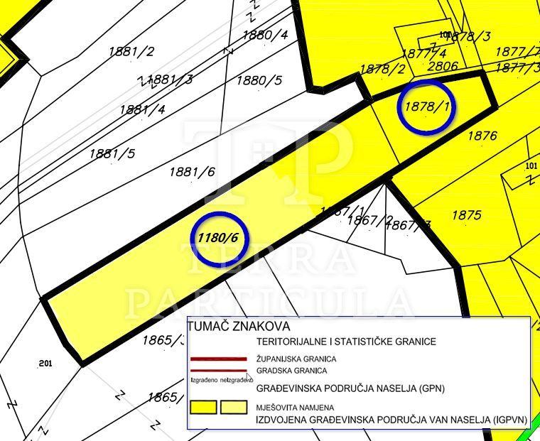 Na prodaju nudimo gradilište površine 1342 čhv-a, odnosno 4.828 m² koje se nalazi u građevinskoj zoni uz kuću. Na njemu se nalazi montažni objekt od cca 35 m² sa priključkom vode i struje dok je šaht za priključenje kanalizacije kaj njega. Zemljište je moguće parcelirati na više manjih gradilišta, a za što je napravljeno idejno rješenje.