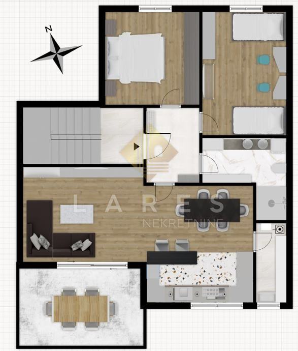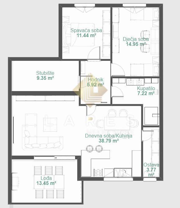 Stan se sastoji od dnevnog boravka sa blagovaonom i kuhinjom, dvije spavaće sobe, ostave, kupaonice, hodnika i loggie.