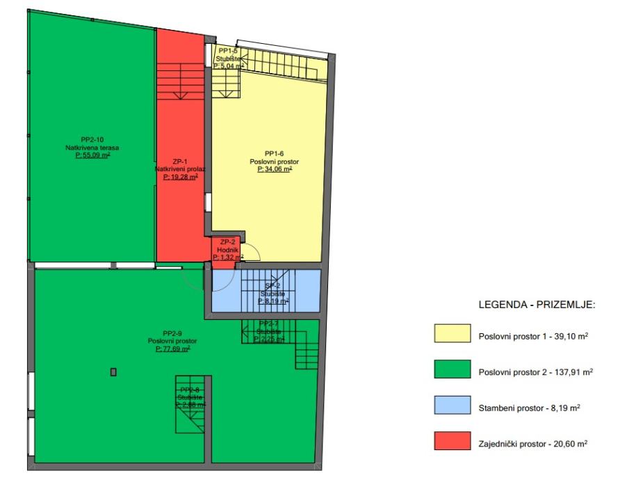 PRIZEMLJE: sastoji se od stubišta i poslovnog prostora, ukupne neto korisne površine 39,10 m2.