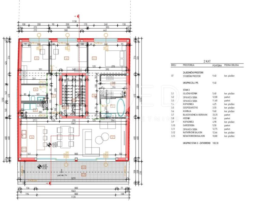 Stan se sastoji od 108,38 m2 zatvorenog prostora: