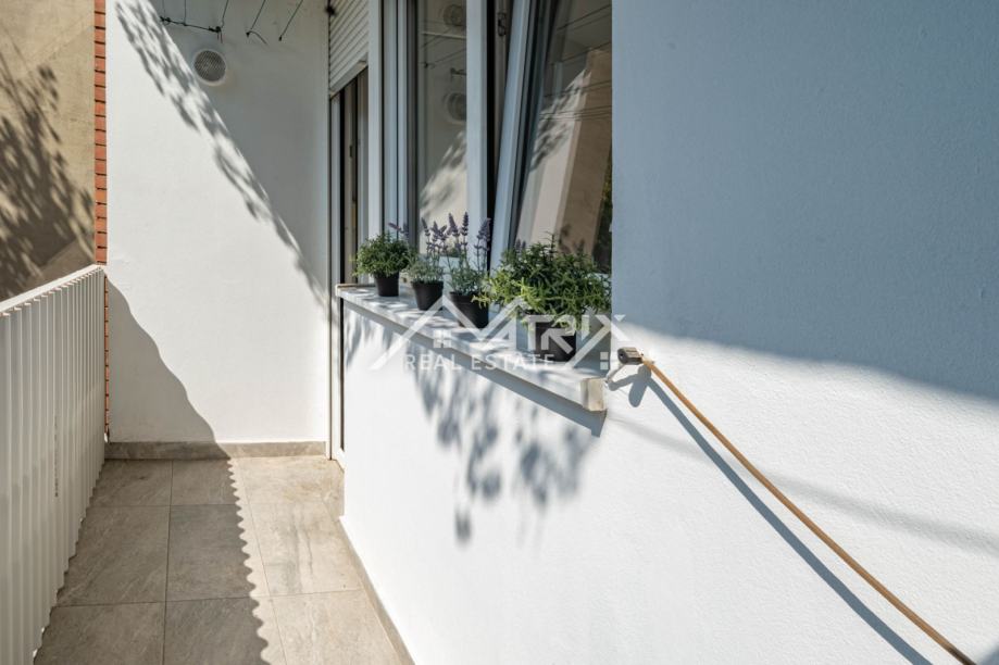 Stan je dvostrano orijentiran, što omogućuje dobru prirodnu osvijetljenost tijekom cijelog dana. Lođa pruža dodatan prostor za opuštanje ili uživanje u jutarnjoj kavi. Stan je opremljen PVC stolarijom, a grijanje je osigurano putem gradskog centralnog sustava. U dnevnom boravku je postavljen i klima uređaj za dodatnu udobnost tijekom toplijih mjeseci.