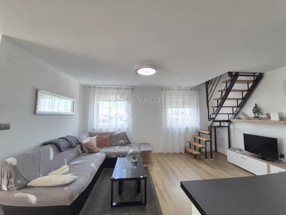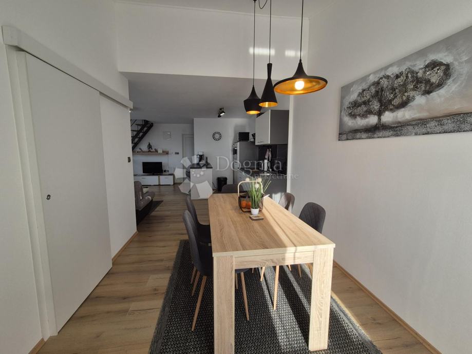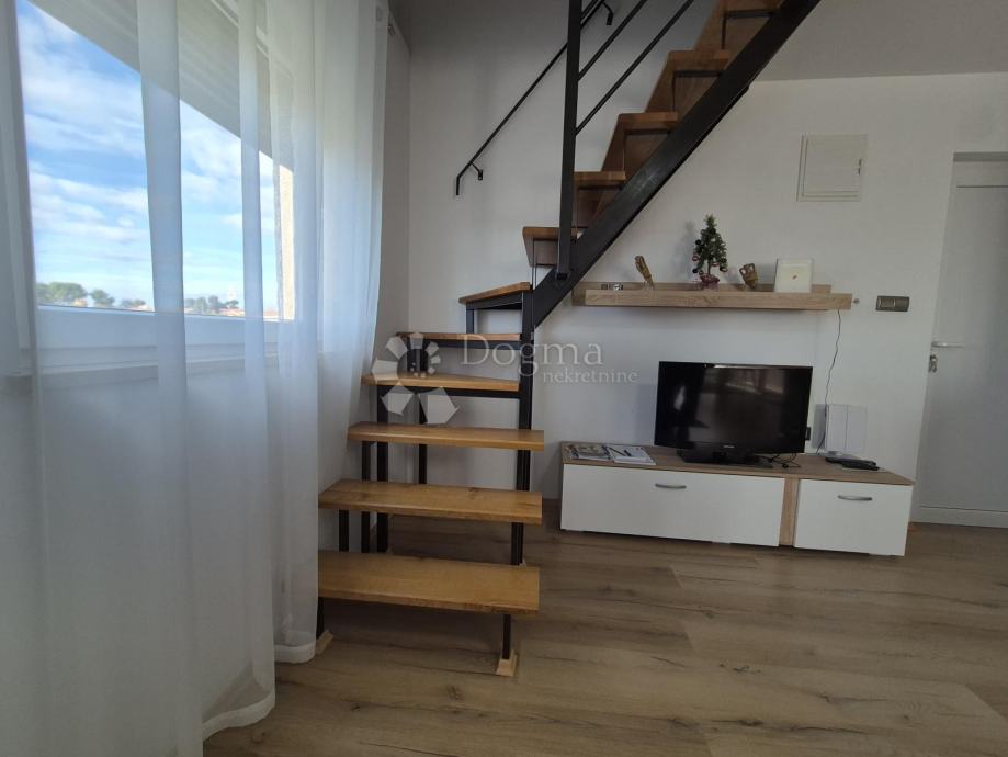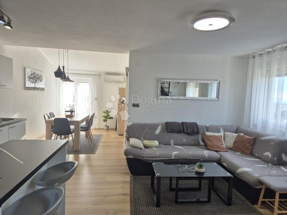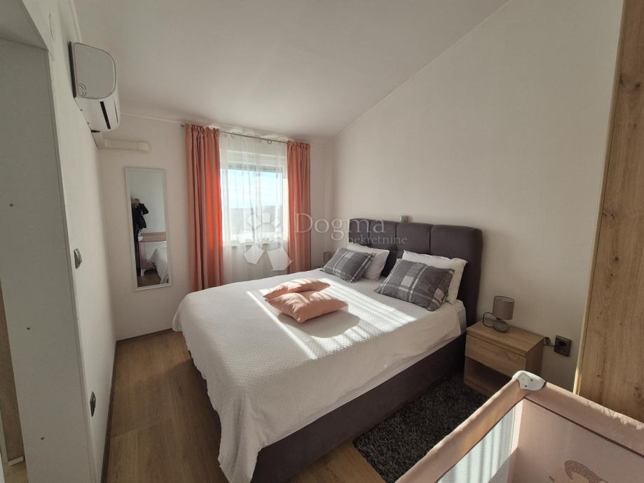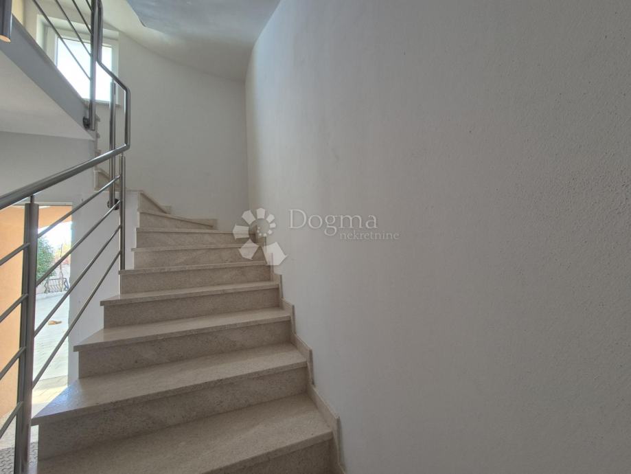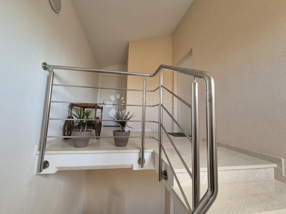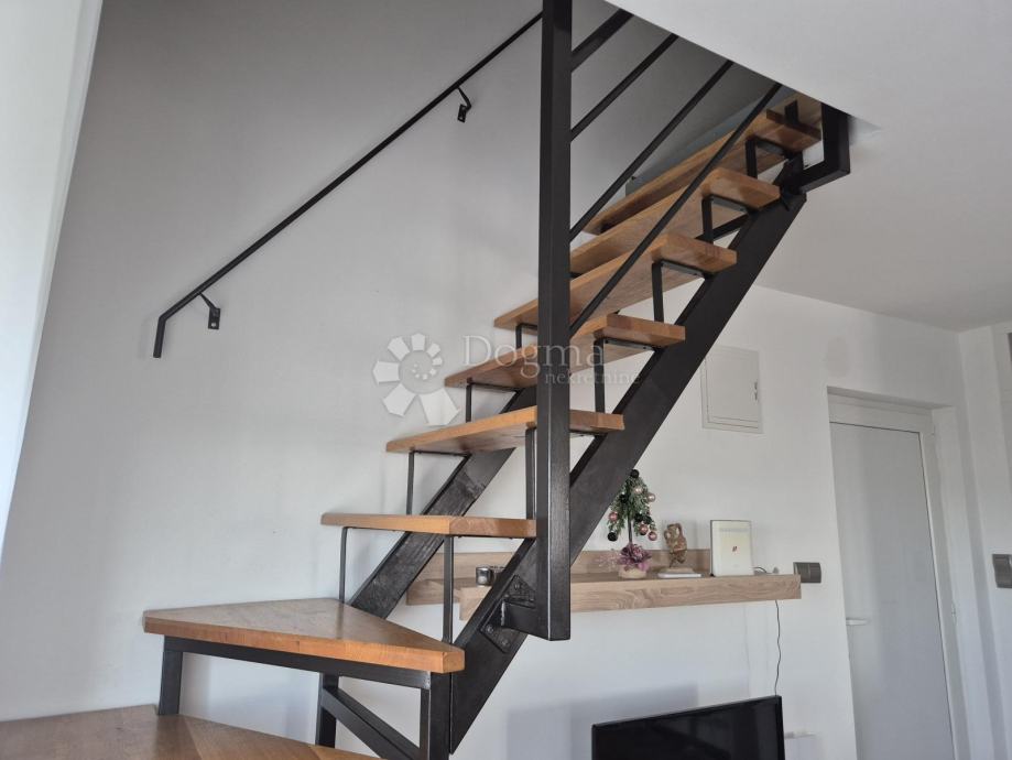 Smješten na drugom katu manje obiteljske zgrade, stan se prostire na dvije etaže. Na prvoj etaži nalazi se kupaonica, jedna spavaća soba te prostrani open space dnevni boravak, kuhinja i blagovaona iz kojih se izlazi na terasu s prekrasnim pogledom prema moru. Na drugoj etaži smještena je još jedna kupaonica i prostrana spavaća soba. Stanu pripadaju dva parkirna mjesta u dvorištu te manja drvarnica.