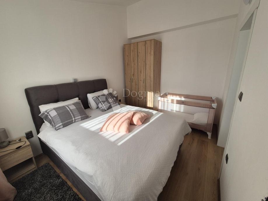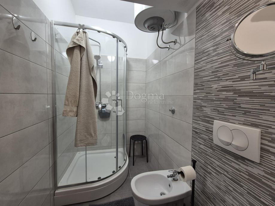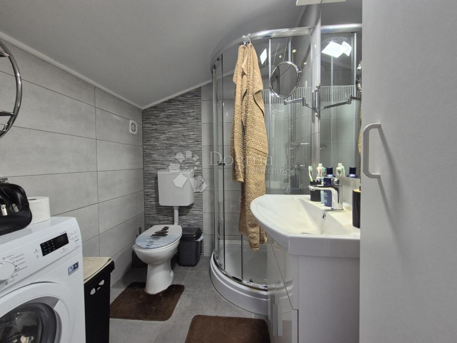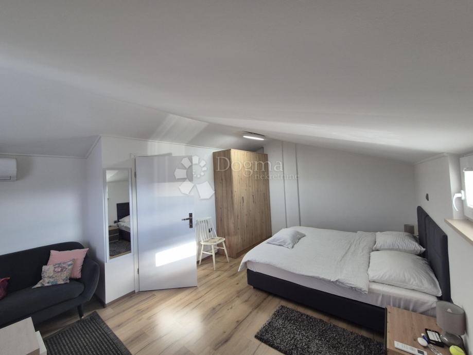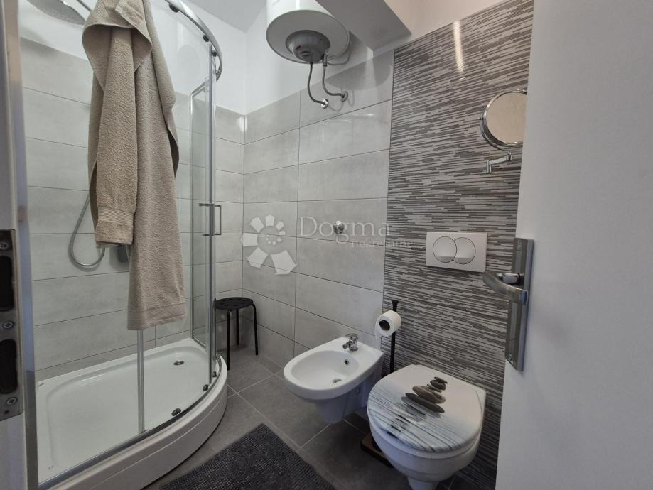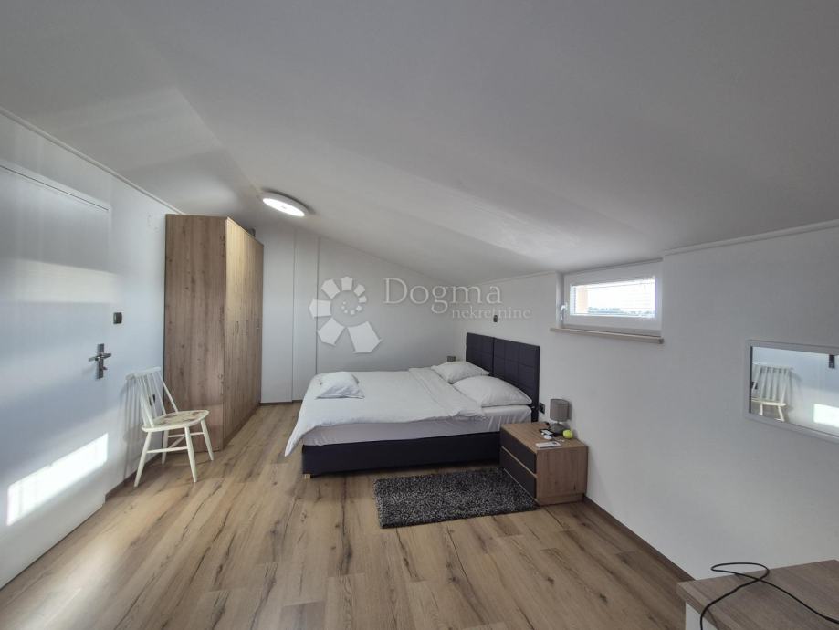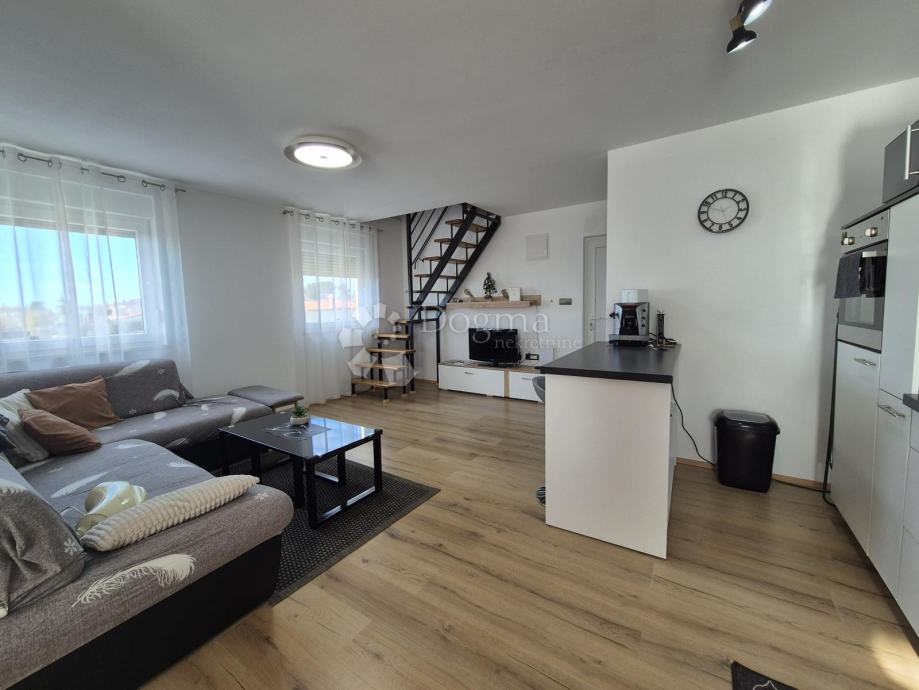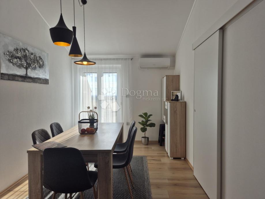 Smješten na drugom katu manje obiteljske zgrade, stan se prostire na dvije etaže. Na prvoj etaži nalazi se kupaonica, jedna spavaća soba te prostrani open space dnevni boravak, kuhinja i blagovaona iz kojih se izlazi na terasu s prekrasnim pogledom prema moru. Na drugoj etaži smještena je još jedna kupaonica i prostrana spavaća soba. Stanu pripadaju dva parkirna mjesta u dvorištu te manja drvarnica.