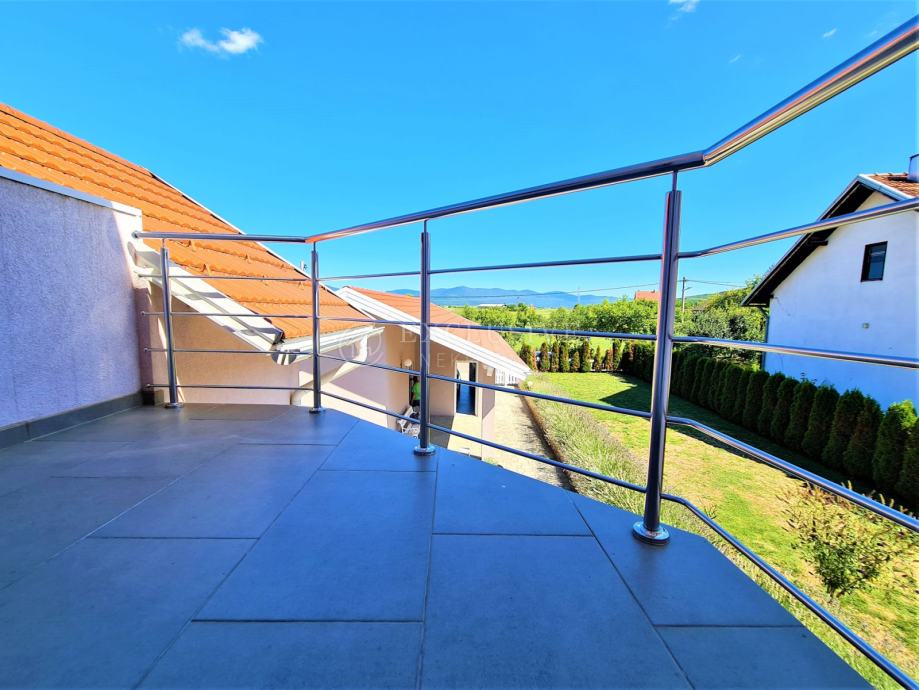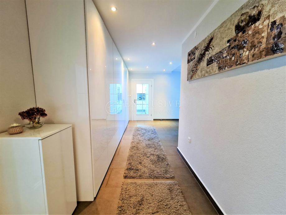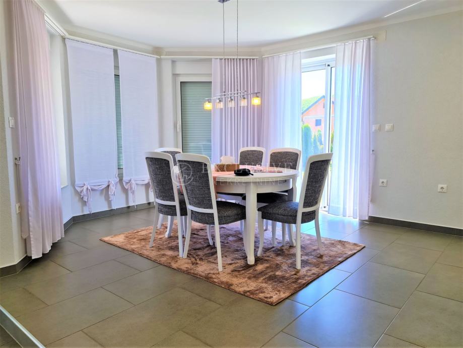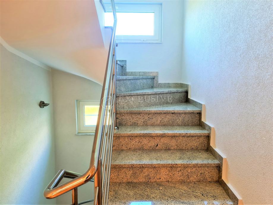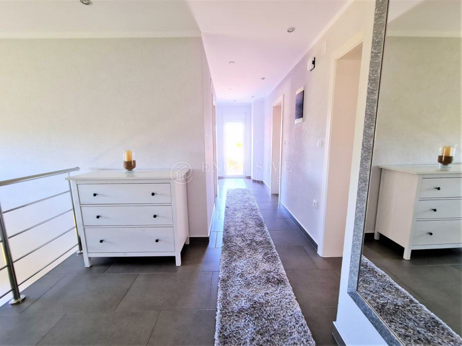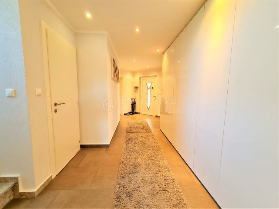 Spoj kuće i garaže predstavlja lijepa velika terasa, preko koje dolazimo na ulazna vrata i prizemnu etažu koju čini prostrani ulazni hodnik, spavaća soba, velika moderna kupaona, stepenište za na kat i u podrumski dio, gostinjski wc, vešeraj, luksuzna kuhinja sa blagovaonom i ostavom te prostrani dnevni boravak iz kojega se izlazi na manju natkrivenu terasu idealnu za druženje, kavice i uživanje.