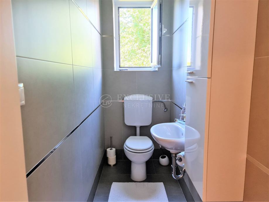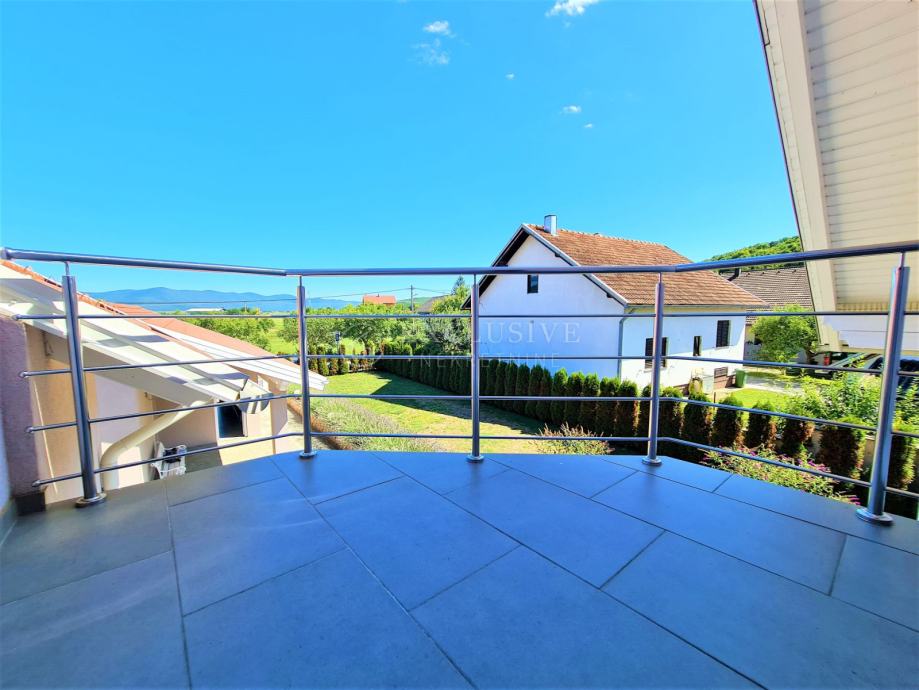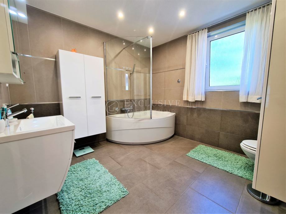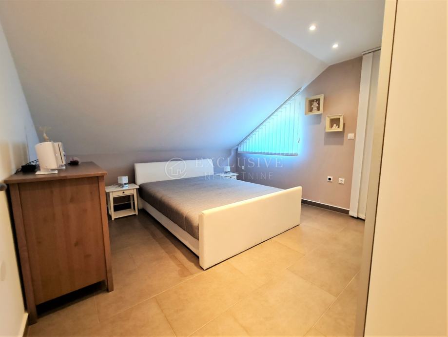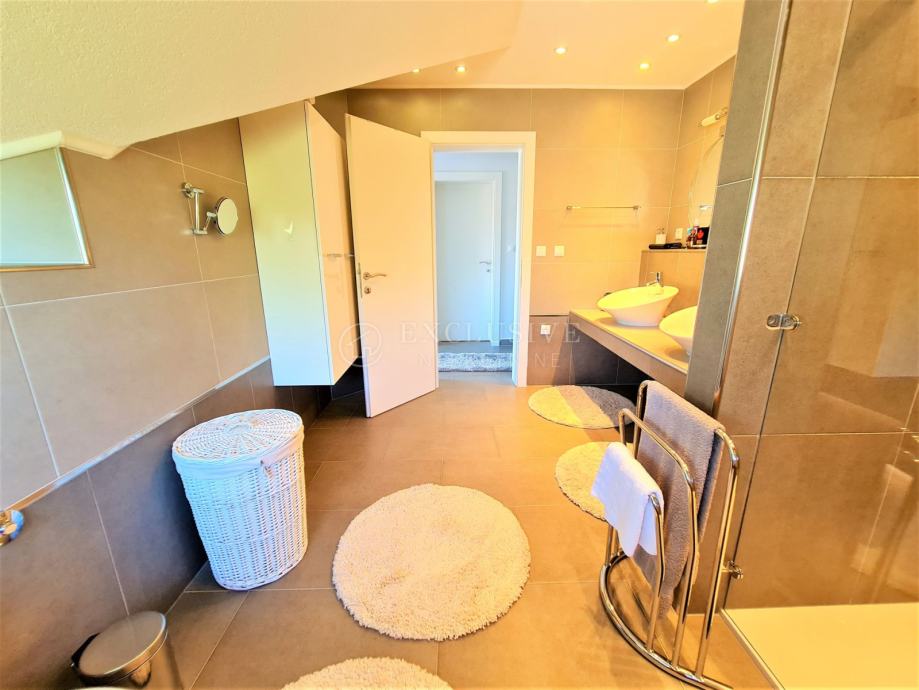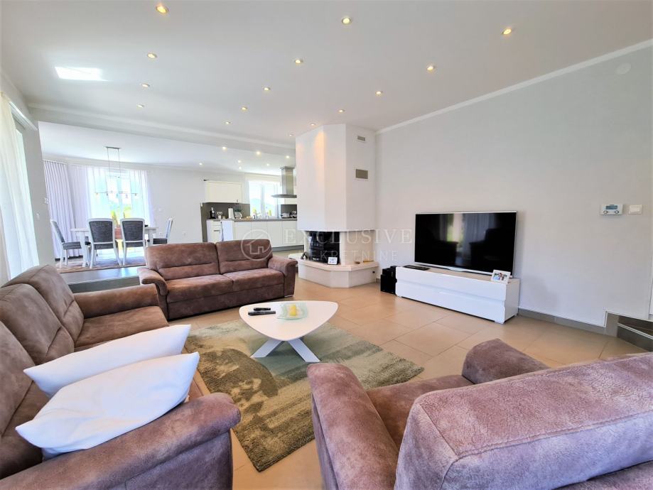 Spoj kuće i garaže predstavlja lijepa velika terasa, preko koje dolazimo na ulazna vrata i prizemnu etažu koju čini prostrani ulazni hodnik, spavaća soba, velika moderna kupaona, stepenište za na kat i u podrumski dio, gostinjski wc, vešeraj, luksuzna kuhinja sa blagovaonom i ostavom te prostrani dnevni boravak iz kojega se izlazi na manju natkrivenu terasu idealnu za druženje, kavice i uživanje.
