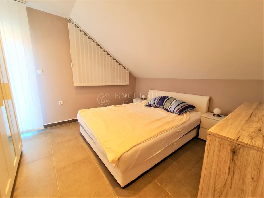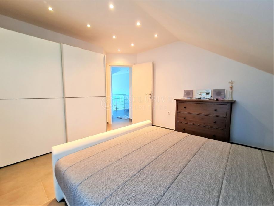 Već prije spomenutim stepenicama penjemo se na kat koji se sastoji od hodnika, tri spavaće sobe, kupaone, dva balkona i terase, te dječje sobe odnosno spremišta koje je jedva stajaće visine.