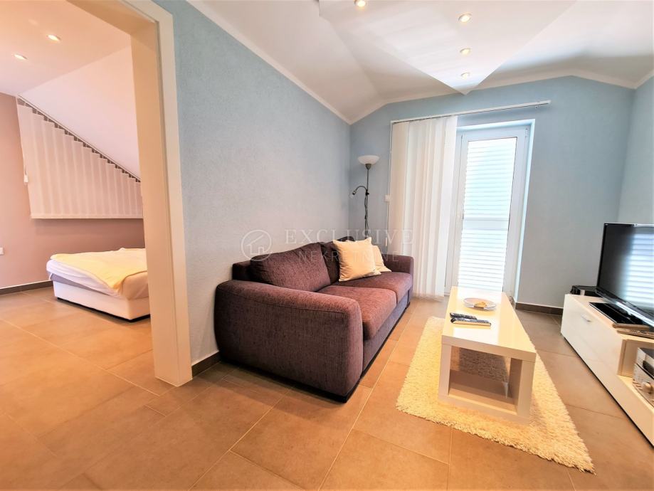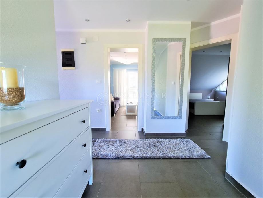 Spoj kuće i garaže predstavlja lijepa velika terasa, preko koje dolazimo na ulazna vrata i prizemnu etažu koju čini prostrani ulazni hodnik, spavaća soba, velika moderna kupaona, stepenište za na kat i u podrumski dio, gostinjski wc, vešeraj, luksuzna kuhinja sa blagovaonom i ostavom te prostrani dnevni boravak iz kojega se izlazi na manju natkrivenu terasu idealnu za druženje, kavice i uživanje.