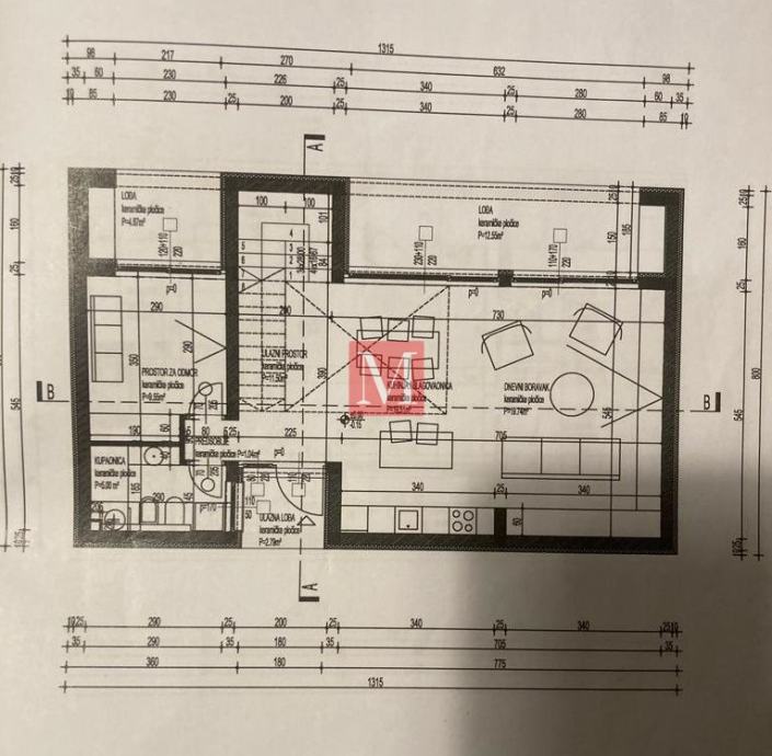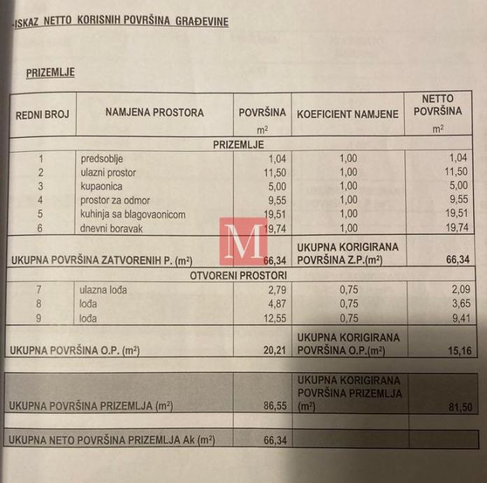 U prizemlju je predprostor, ulazni prostor, kupaonica, soba za odmor, 3 lođe, te kuhinja s blagovaonicom i dnevnim boravkom od 40 m2.