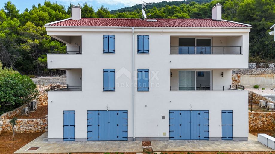 Novogradnja građena vrhunskim materijalima i opremljena modernom opremom. Suvremeni stil, mediteranski šarm, bijela fasada sa plavim prozorima. Nekretnina koja će Vas očarati!