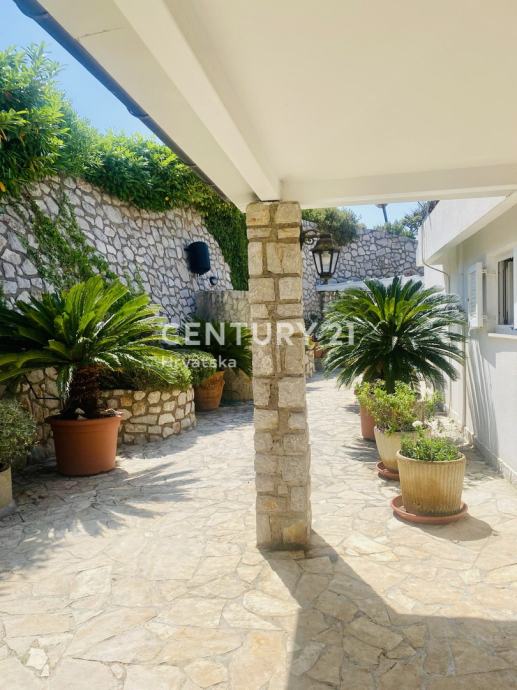 Vrt/dvorište je površine 500 m2, formiran je sa prekrasnim 20 godina starim palmama, vanjski zatvoreni tuš, terasa sa pergolom, vanjska ljetna kuhinja sa kaminom.