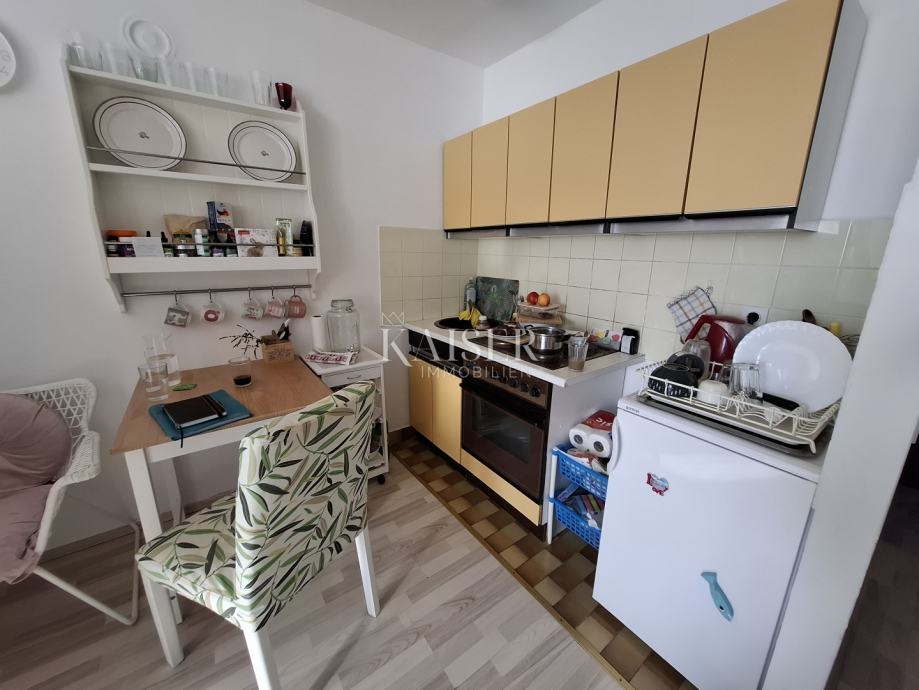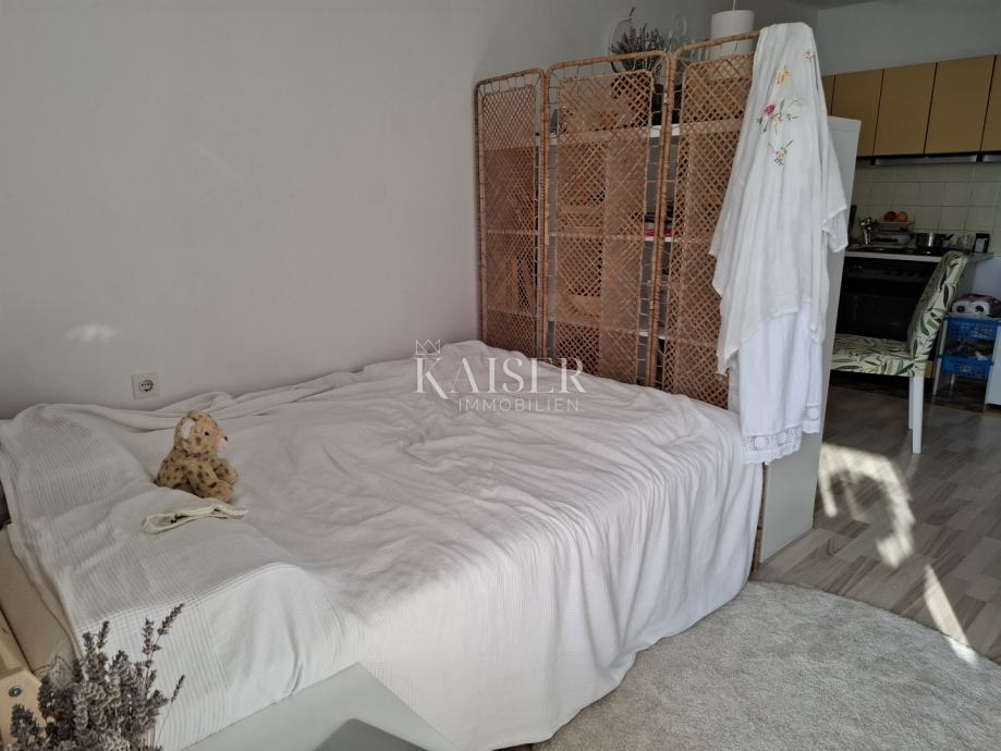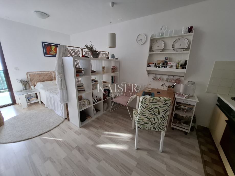 Kaiser-Immobilien predstavlja prekrasan apartman/garsonijeru, 250 m od mora, koji se sastoji od ulaznog prostora, hodnika, kupaonice, open-space sobe/blagovaonice/kuhinje, ukupne površine 28 m2, te prelijepog balkona sa panoramskim pogledom na istarski poluotok i cresko-lošinjski arhipelag, na kojem se mogu doživjeti neponovljivi zalasci sunca.