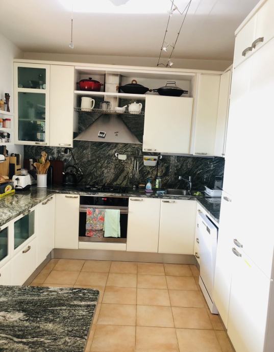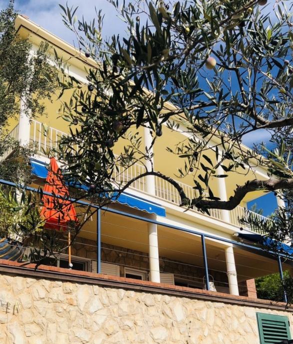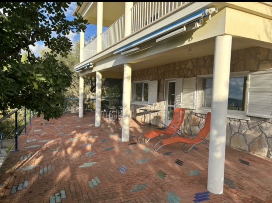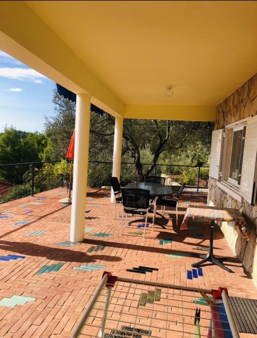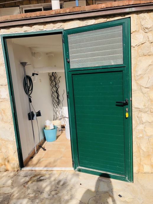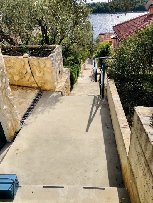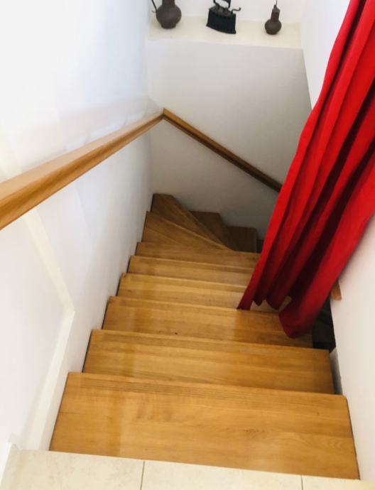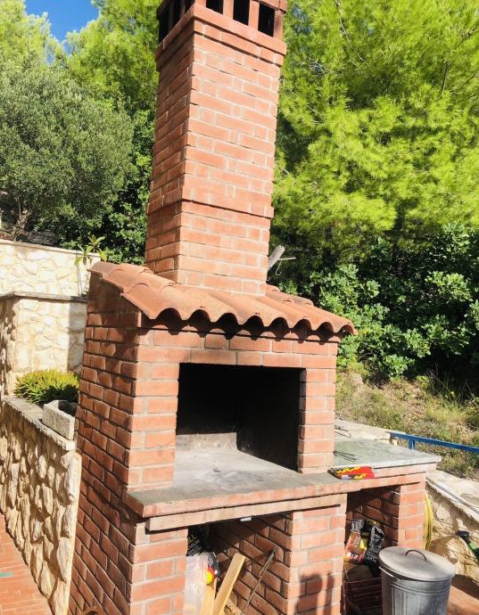 Na prvoj etaži je kuhinja, blagovaona, kupatilo, soba i velika terasa (cca 100m2),vrtni roštilj, vanjska kamenica( sve okruženo zelenilom…masline, rogač..) i lijepim pogledom