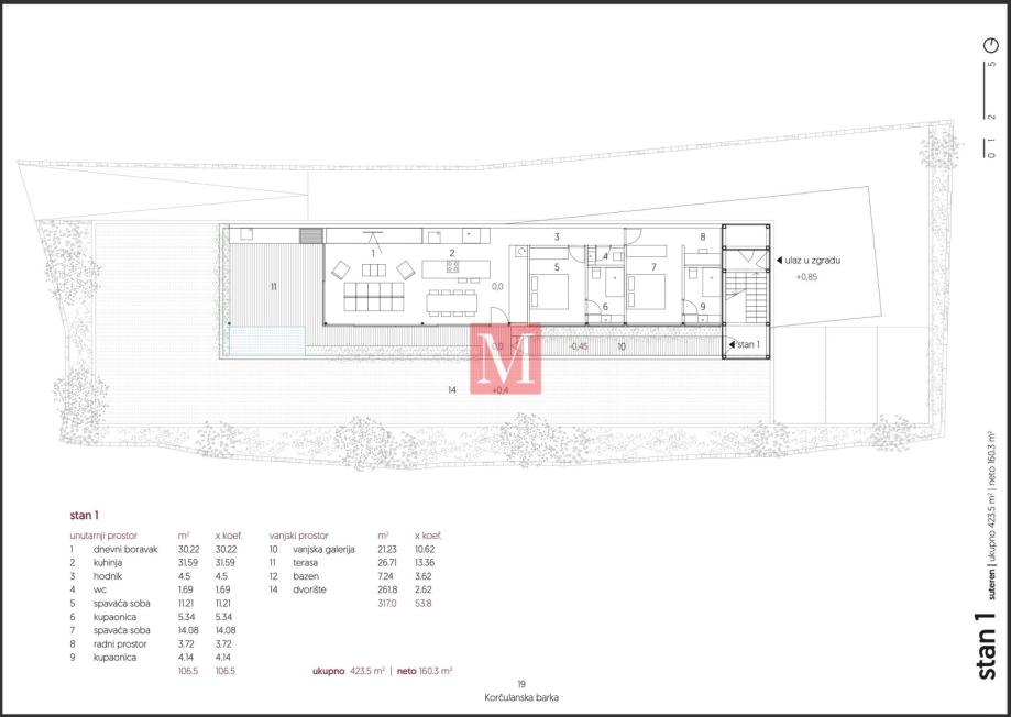 Prodaje se 3s stan NKP 106,5 m2 s terasom NKP 13,36 m2 (bruto 26,71 m2), dvorištem NKP 2,62 (bruto 261,18 m2), bazenom NKP 3,62 m2 (bruto 7,24 m2), vanjskom galerijom NKP 10,62 (bruto 21,23 m2) te dva natkrivena parkirna mjesta - ukupno prodajno 160,30 m2.
