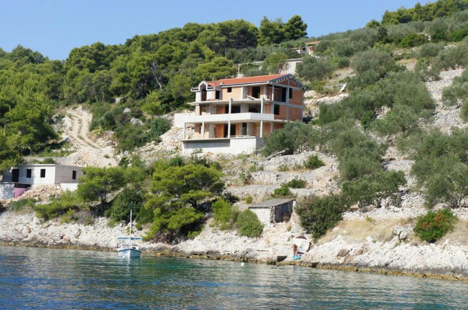 Korčula Island. Villa for sale, first row to the sea, with a building permit, which has been completed in unfinished form. The villa has 344 m2 of gross developed area and was built on a plot of land of 570 m2.