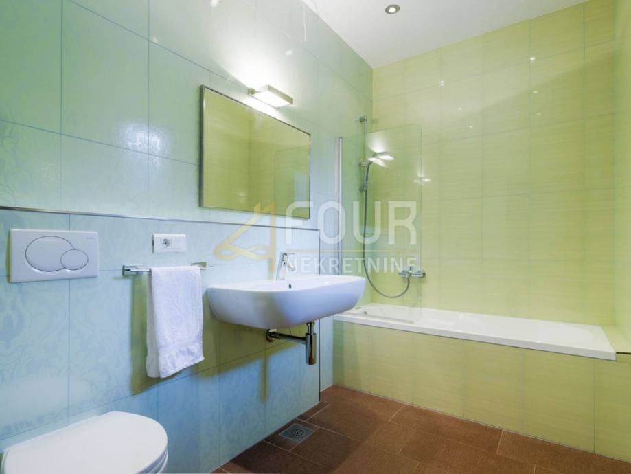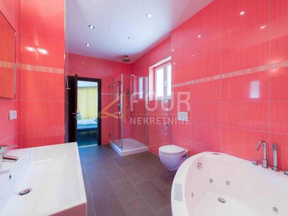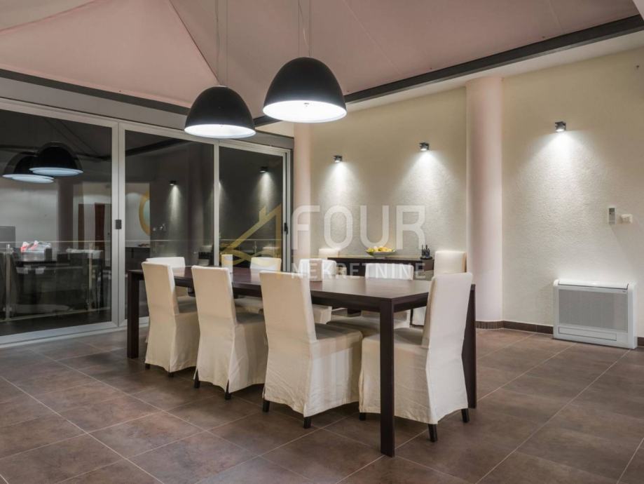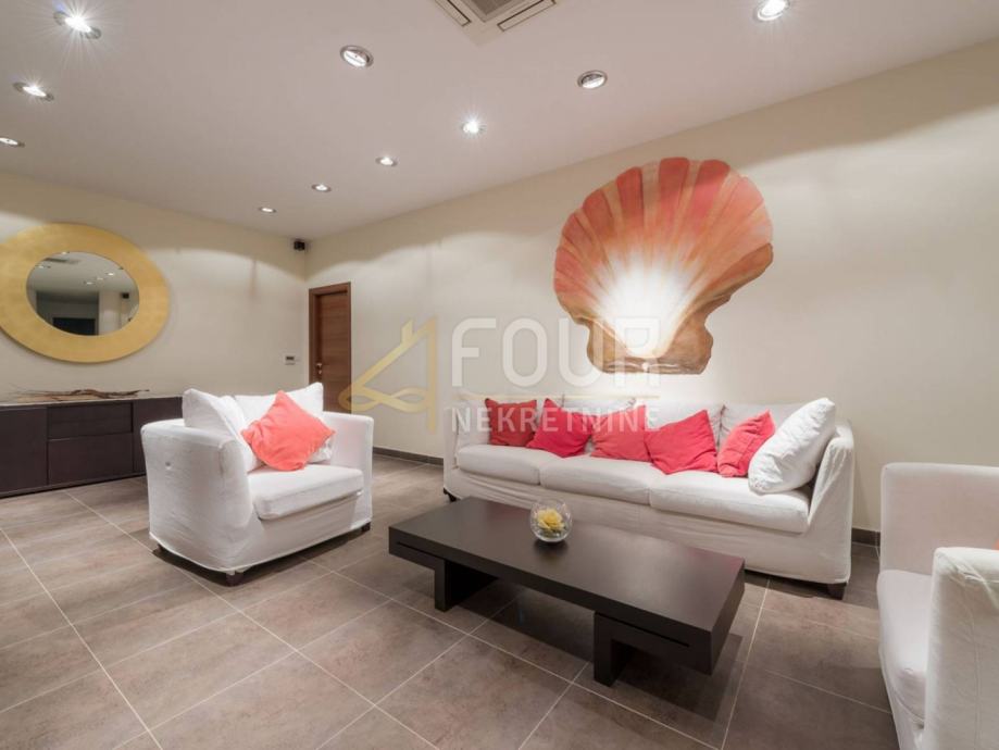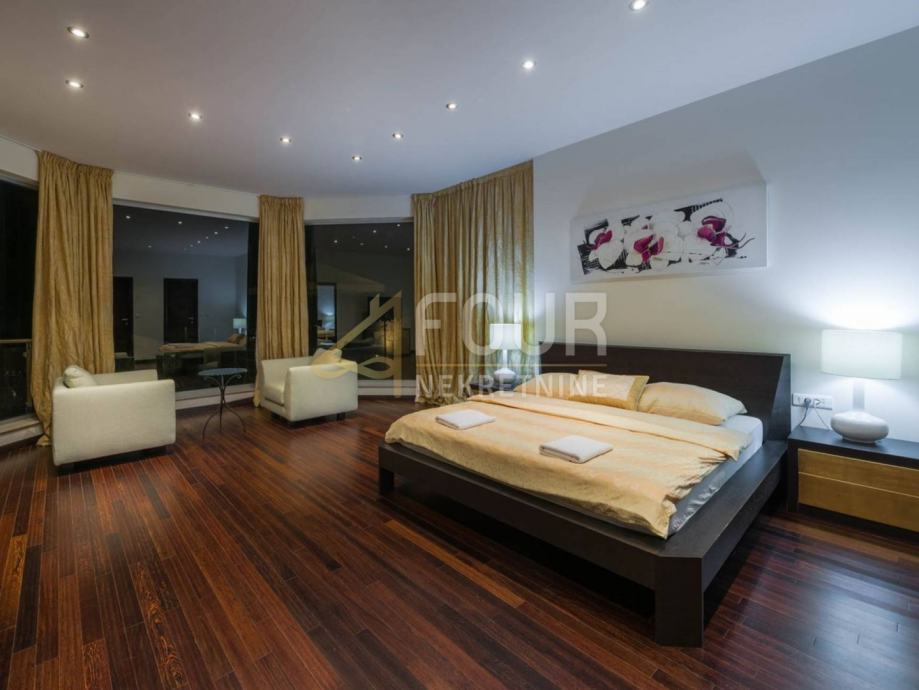 Prostire se na dva kata s ukupno 520 m2 prostora i prostranom okućnicom koja uključuje vrtove, bazen i terase. Unutrašnjost odiše elegancijom i funkcionalnošću – prostrani dnevni boravak i blagovaonica, potpuno opremljena kuhinja, klimatizirani prostori s podnim grijanjem te raskošne spavaće sobe s vlastitim kupaonicama stvaraju atmosferu privatnog luksuznog resorta.