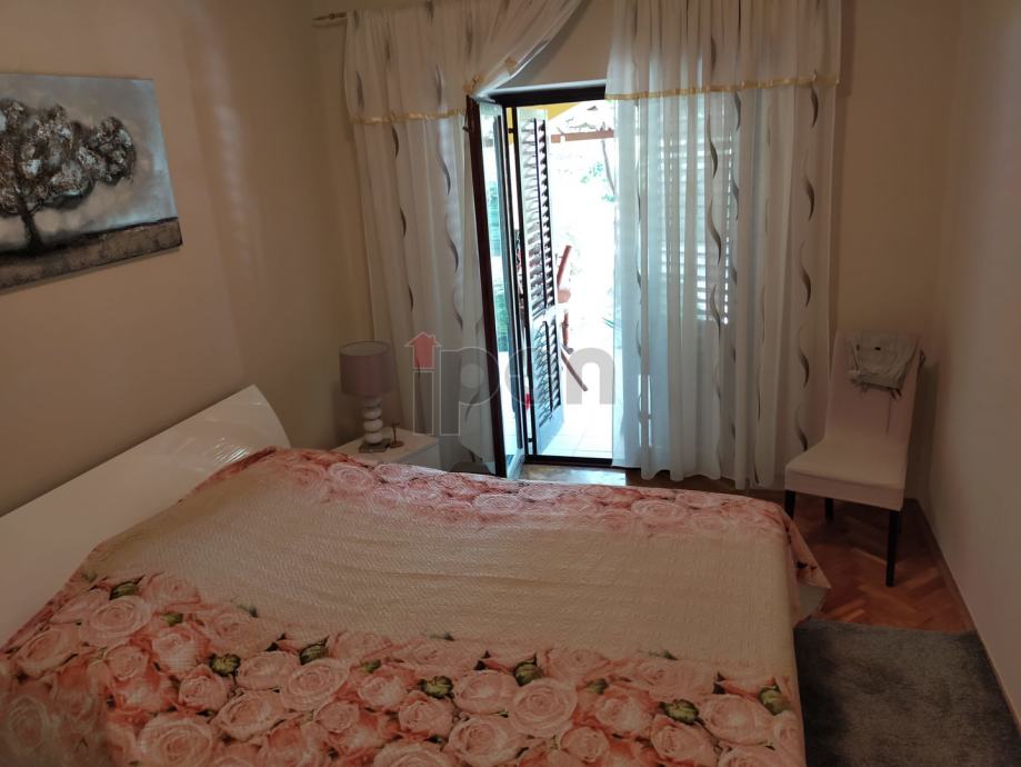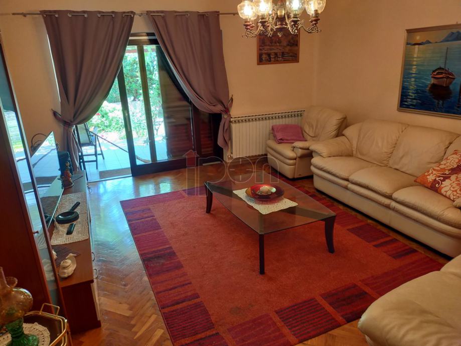 U prodaji je stan od 107 m2 sa ograđenom cvjetnom okućnicom od 124 m2. Sastoji se od hodnika, toaleta, vešeraja, velike kupaonice, blagovaonice, kuhinje, špajze, dvije spavaće sobe i prostranog dnevnog boravka iz kojeg se izlazi na brižno njegovanu okućnicu sa terasama, cvijećem, prostorom za sunčanje, kaminom i voćnjakom.